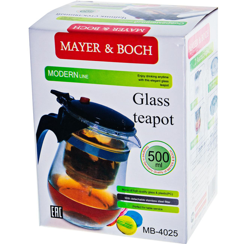 Чайник заварочный Mayer&Boch 4025 стеклянный 500 мл. Заварочный чайник Mayer&Boch объемом 500 мл с металлическим фильтром изготовлен из термостойкого боросиликатного стекла. Крышка и ручка из пластика, фильтр из нержавеющей стали. Заварочный чайник был разработан инженерами и дизайнерами марки Mayer&Boch при участии Британского Чайного Совета и сразу же приобрел своих поклонников. Эстетичный и функциональный, с современным дизайном, заварочный чайник будет прекрасно смотреться в любом интерьере. Подходит для мытья в посудомоечной машине.