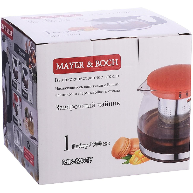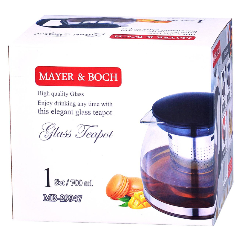 Чайник заварочный Mayer&Boch 29947 стеклянный 700 мл. Заварочный чайник Mayer&Boch объемом 700 мл, изготовлен из термостойкого стекла, фильтр выполнены из нержавеющей стали. Изделия из стекла не впитывают запахи, благодаря чему вы всегда получите натуральный, насыщенный вкус и аромат напитков. Заварочный чайник из стекла удобно использовать для повседневного заваривания чая практически любого сорта. Но цветочные, фруктовые, красные и желтые сорта чая лучше других раскрывают свой вкус и аромат при заваривании именно в стеклянных чайниках, а также сохраняют все полезные ферменты и витамины, содержащиеся в чайных листах. Стальной фильтр гарантирует прозрачность и чистоту напитка от чайных листьев, при этом сохранив букет и насыщенность чая. Прозрачные стенки чайника дают возможность насладиться насыщенным цветом заваренного чая. Изящный заварочный чайник Mayer&Boch будет прекрасно смотреться в любом интерьере. Подходит для мытья в посудомоечной машине. Внимание! Товар поставляется в различных вариантах дизайна без возможности выбора.