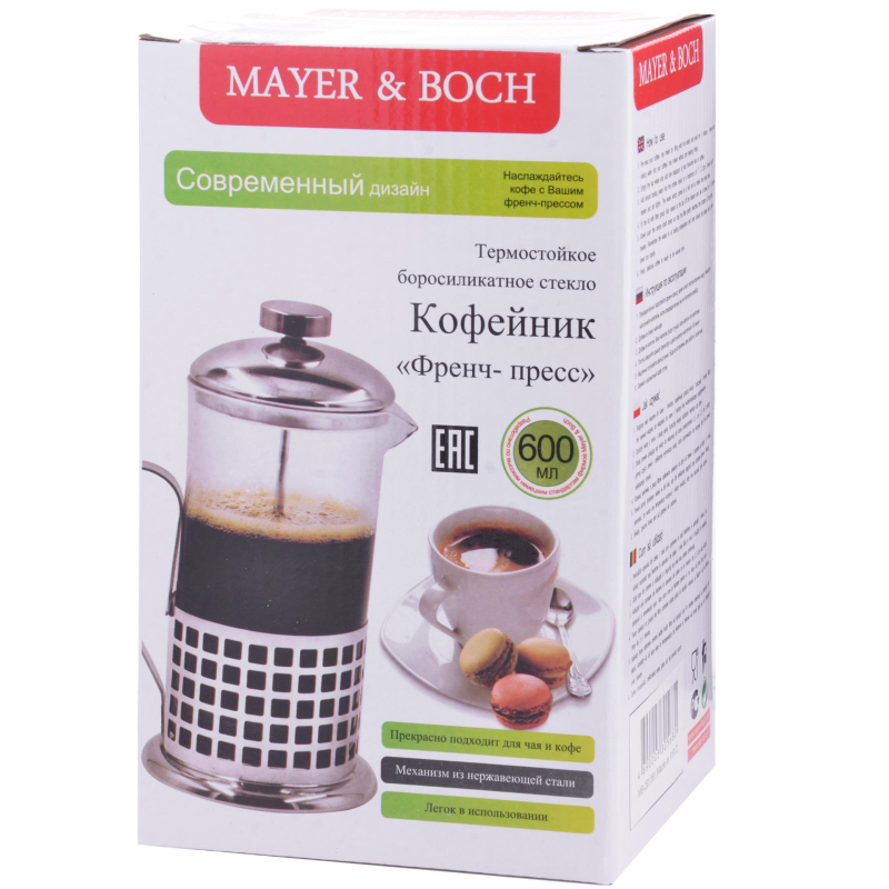 Френч-пресс Mayer&Boch 600 мл (29139). Френч-пресс изготовлен из высокотехнологичных материалов на современном оборудовании. Колба из высококачественного термостойкого боросиликатного стекла заключена в корпус из нержавеющей стали. Объем: 600 мл. Фильтр-поршень из нержавеющей стали выполнен по технологии press-up для обеспечения равномерной циркуляции воды в чайнике. Удобная, не нагревающаяся ручка также выполнена из качественной нержавеющей стали. Практичный и стильный дизайн полностью соответствует последним модным тенденциям в создании предметов бытовой техники. Френч-пресс Mayer&Boch позволит вам быстро и без усилий приготовить свежий ароматный кофе или чай. Подходит для мытья в посудомоечной машине. Не использовать чистящие и дезинфицирующие средства, содержащие хлор. Не подходит для использования на открытом огне.