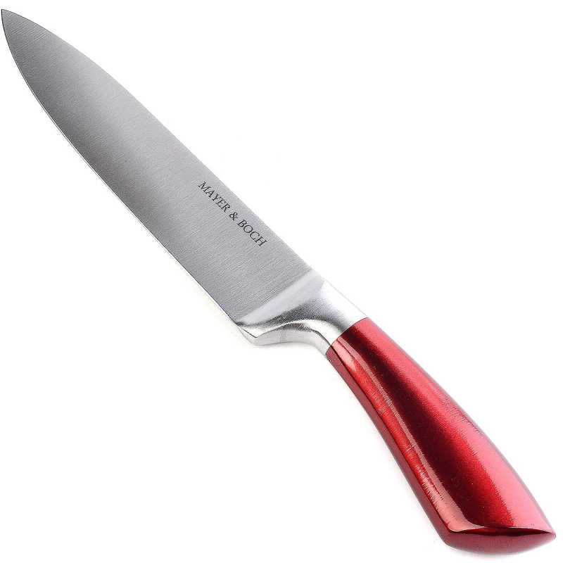 Нож кухонный Mayer&Boch поварской лезвие 20 см (31407). Нож Mayer&Boch с лезвием из высококачественной нержавеющей стали станет незаменимым помощником на Вашей кухне. Сечение ножа - клинообразно, что позволяет режущей кромке клинка быть продолжительное время острой. Поверхность клинка легко моется, не впитывает и не передает запахи пищи при нарезке различных продуктов. Этот нож идеально подойдет для нарезки крупных твердых овощей и фруктов, разделки курицы, крупной рыбы или мяса, широкой боковой стороной лезвия удобно давить чеснок. Эргономичная рукоятка ножа удобно ложится в ладонь, обеспечивая безопасную работу, комфортное положение в руке, надежный захват и не дает ножу скользить при использовании. Длина ножа: 33.5 см. Длина лезвия: 20 см.