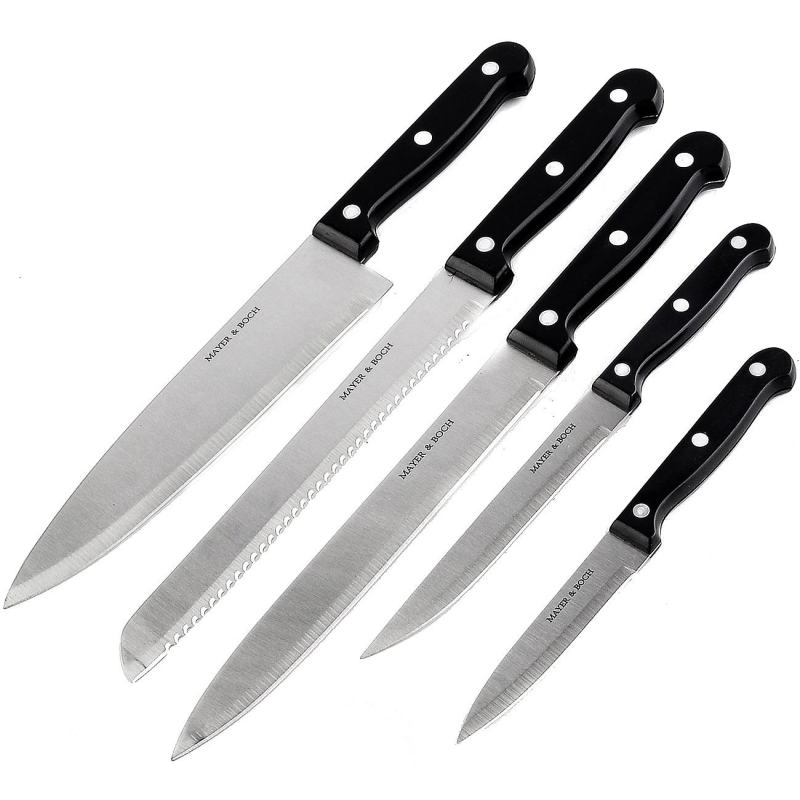 Набор ножей Mayer&Boch 5 штук (30741). Набор ножей Mayer&Boch с лезвиями из высококачественной нержавеющей стали станет незаменимым помощником на вашей кухне. Лезвия изготовлены из высококачественной нержавеющей стали. Поверхность клинков легко моется, не впитывает и не передает запахи пищи при параллельной нарезке различных продуктов. Набор ножей идеально подойдет для резки как мяса и рыбы, так и фруктов и овощей. При помощи керамического ножа-пиллера вы быстро и тонко сможете очистить овощи. Эргономичная рукоятка каждого изделия удобно ложится в ладонь, обеспечивая безопасную работу, комфортное положение в руке, надежный захват и не дает ножам скользить при использовании. В наборе: Нож поварской: 31,5 см, лезвие 18,5 см. Нож хлебный: 32,5 см, лезвие 19,5 см. Нож разделочный: 32,5 см, лезвие 19,5 см. Нож универсальный: 23,5 см, лезвие 12,5 см. Нож для очистки: 19,5 см, лезвие 8,5 см. Яркий дизайн изделий украсит вашу кухню, а благодаря красивой упаковке, такой набор станет еще и прекрасным подарком!
