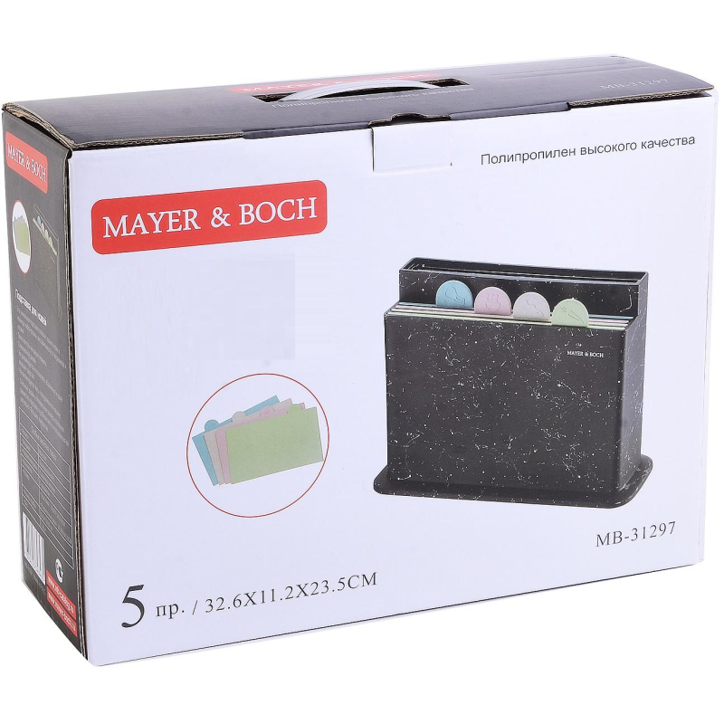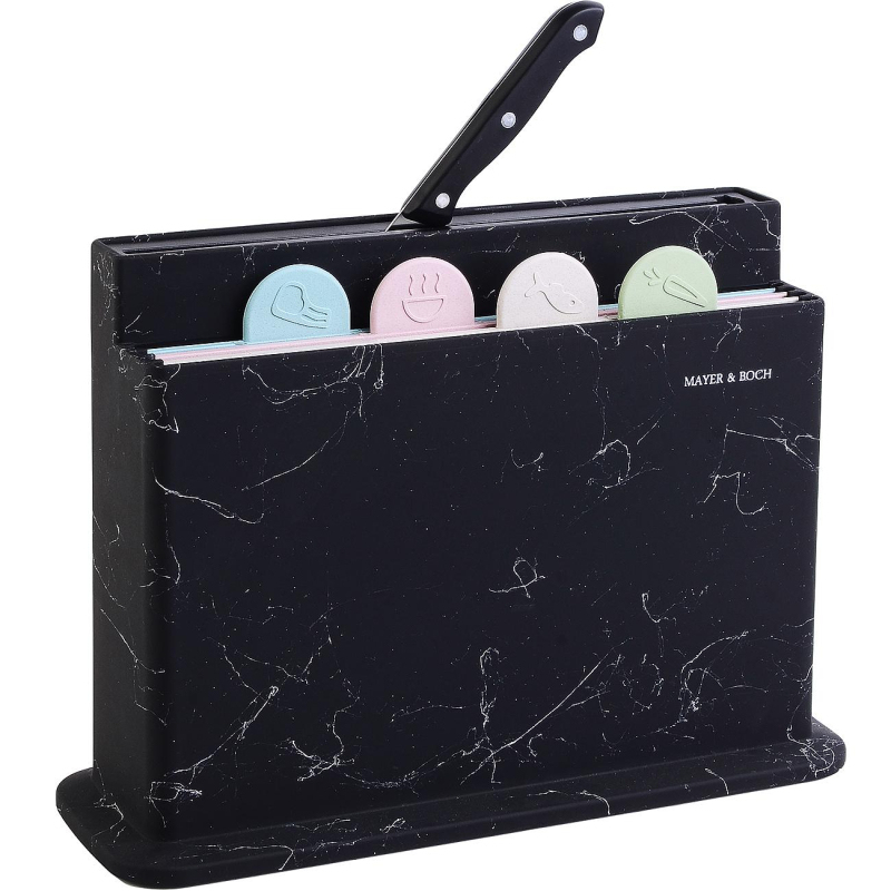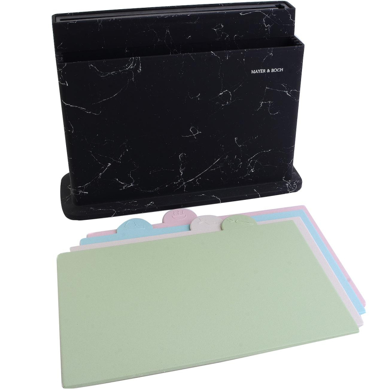 Набор разделочных досок с подставкой для ножей Mayer&Boch состоит из четырех разноцветных досок, размещенных в оригинальной подставке, что делает набор не только многофункциональным, но и очень удобным для хранения на кухне. Цветные разделочные доски выполнены из прочного пищевого пластика с добавлением пшеничного волокна и могут использоваться для нарезки сырого мяса и рыбы, овощей, фруктов, варенных и копченых продуктов, хлеба и т.д. Небольшой выступающий ярлычок, имеющийся на каждой из досок, позволяет с легкостью извлекать их из подставки. Каждый ярлычок отмечен рисунком продуктов, для которых предназначена доска: для рыбы, для мяса, для овощей и фруктов. В верхней части подставка размещено отделение для хранения ножей. Чтобы ножи не проваливались в подставку в верхней части установлен пластиковый ограничитель. Лезвие ножей свободно входит внутрь подставки, а ручка остается на поверхности, что позволяет извлекать ножи из подставки одним движением руки. На дне подставки имеется несколько отверстия для отведения лишней жидкости. Размер досок на подставке: 27.5x12x 21 см. Набор станет незаменимым и полезным аксессуаром на вашей кухне, который к тому же и стильно дополнит кухонный интерьер.