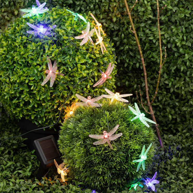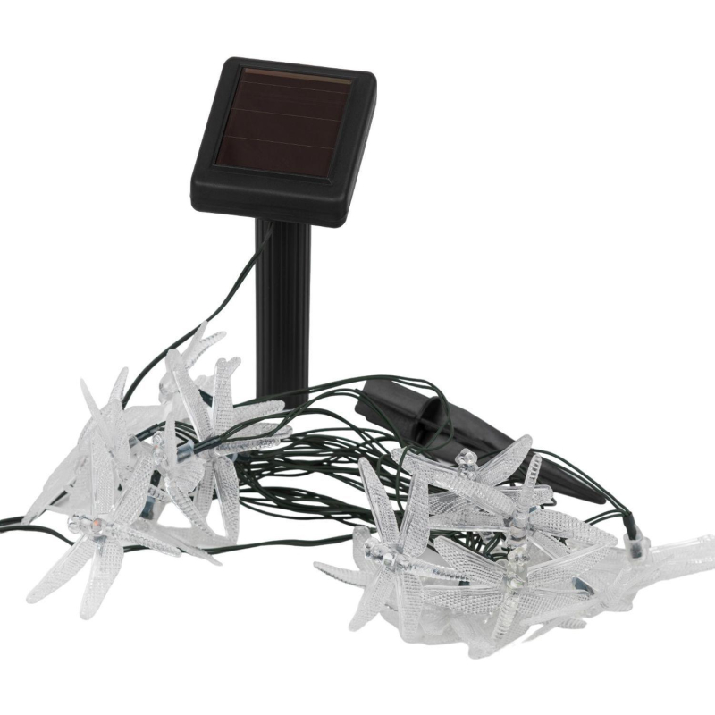 Садовая гирлянда. 20 подсвечиваемых светодиодами лампочек, выполненных в виде стрекоз. Общая длина от солнечной панели до последнего светящегося элемента - 5,8 м. Два режима свечения - постоянный и мигающий.