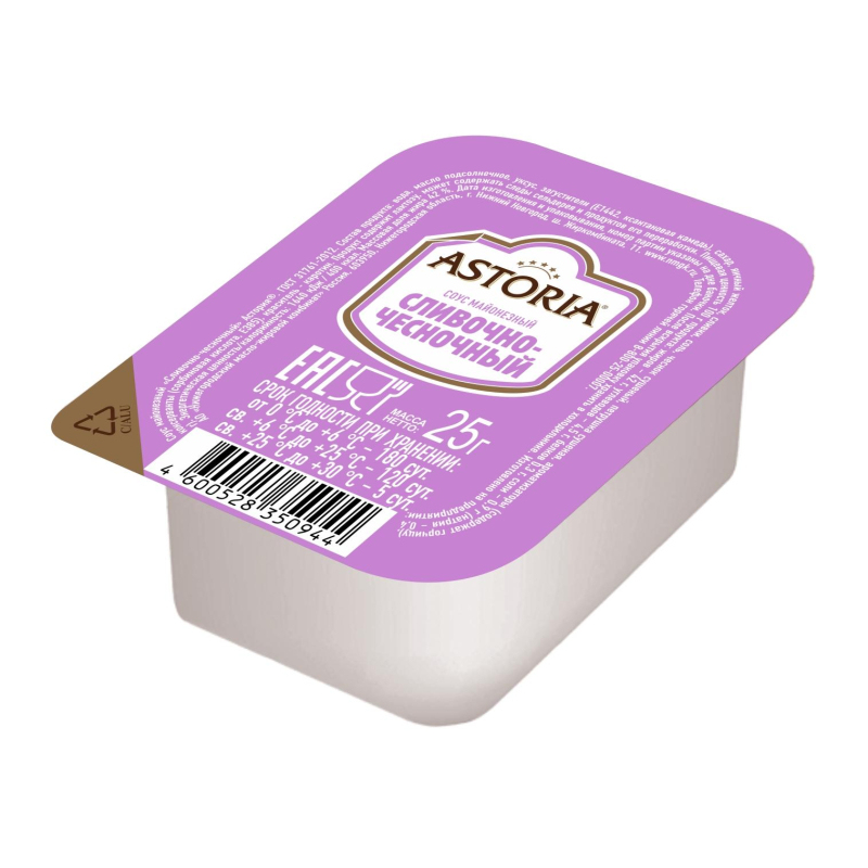 Соус Astoria Сливочно-чесночный 125 штук по 25 мл Состав: вода, масло подсолнечное, уксус, загустители (Е1442, ксантановая камедь), сахар, яичный желток, сливки, соль, чеснок сушеный, петрушка сушеная, ароматизаторы (содержат горчицу), консерванты (сорбиновая кислота, Е385), краситель - каротин. Продукт содержит лактозу, может содержать следы орехов, сельдерея и продуктов их переработки. Вес: 25 мл.