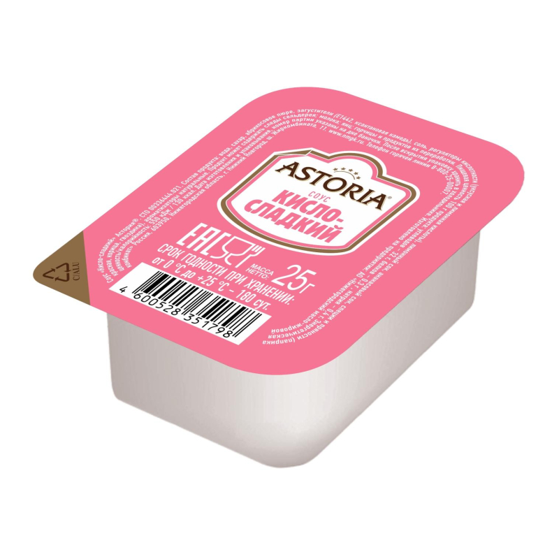 Соус Astoria Кисло-сладкий 125 штук по 25 мл Состав: вода, сахар, абрикосовое пюре, загустители (Е1442, ксантановая камедь), соль, регуляторы кислотности (уксусная и лимонная кислоты), лимонный сок, ананасовый сок, специи и пряности (паприка красная, корица, гвоздика), ароматизаторы натуральные. Продукт может содержать следы сельдерея; молока; яиц; горчицы и продуктов их переработки. Вес: 25 мл.