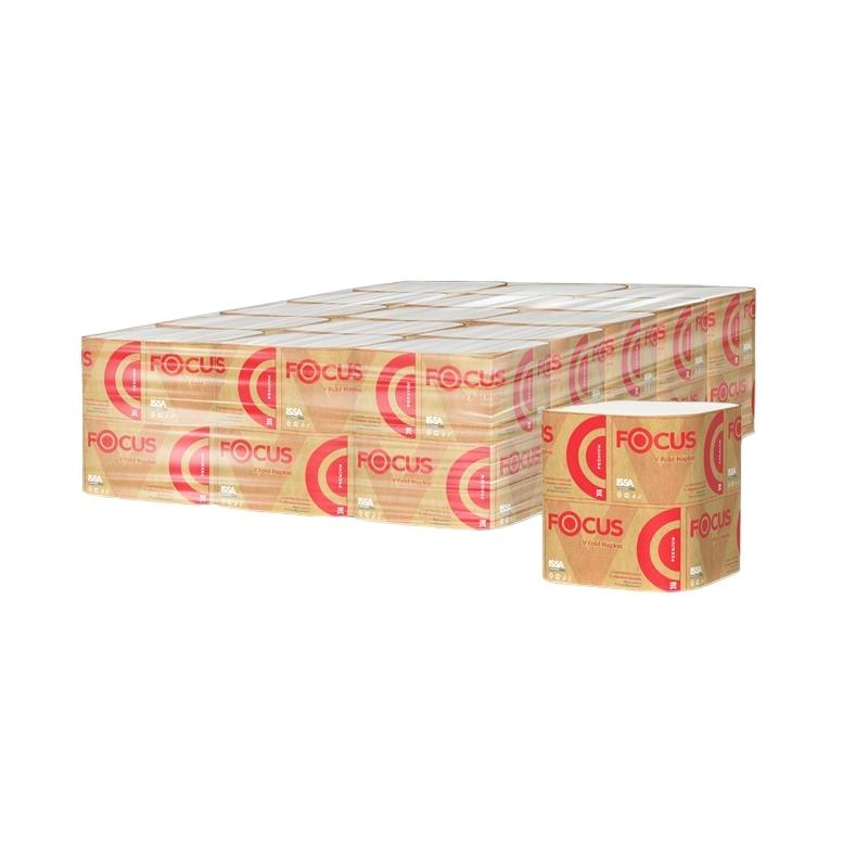 Салфетки бумажные Focus Premium белые 2-слойные 15 пачек по 200 листов Салфетки бумажные Focus V-сложения размещаются в компактном диспенсере, который подойдет под любой интерьер. Листовая подача салфеток поможет лучше контролировать расход и обеспечит максимальную гигиеничность: салфетки выдаются поштучно, что исключает соприкосновение рук со следующим листом. Бумажные салфетки V-сложения - рациональное решение для мест с высокими требованиями к чистоте и гигиене. Упакованная в полиэтиленовый короб бумажная продукция подвержена меньшему влиянию окружающих факторов при транспортировке. Размеры листа: 16,8х23 см.