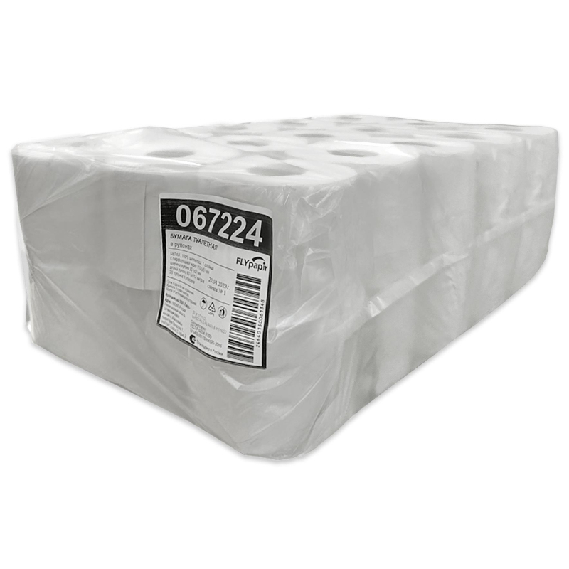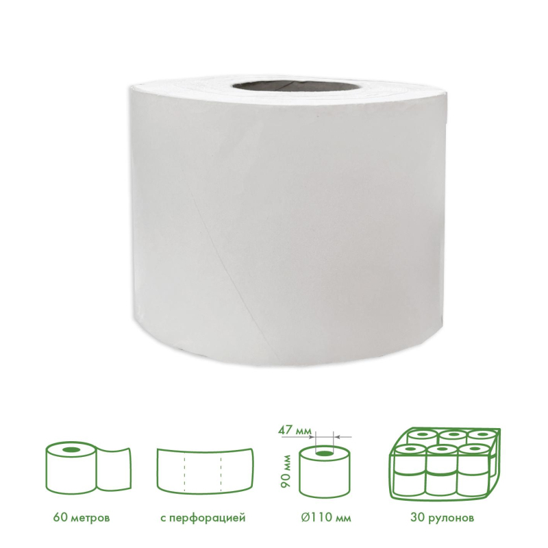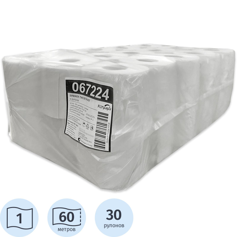 Туалетная бумага в рулонах однослойная, 60 метров, с тиснением и перфорацией, белая (067224). В упаковке 30 рулонов.