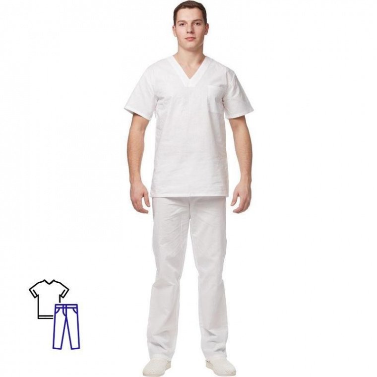 Костюм пекаря универсальный с коротким рукавом состоит из куртки и брюк. Куртка свободного покроя имеет нагрудный накладной карман. Брюки с поясом на резинке. Костюм, предназначенный для использования в производственных цехах, выполнен из бязи плотностью 142 г/кв.м, цвет белый. Размер 48–50, рассчитан на рост 182–188 см. Температурный режим стирки — не выше 40 градусов.