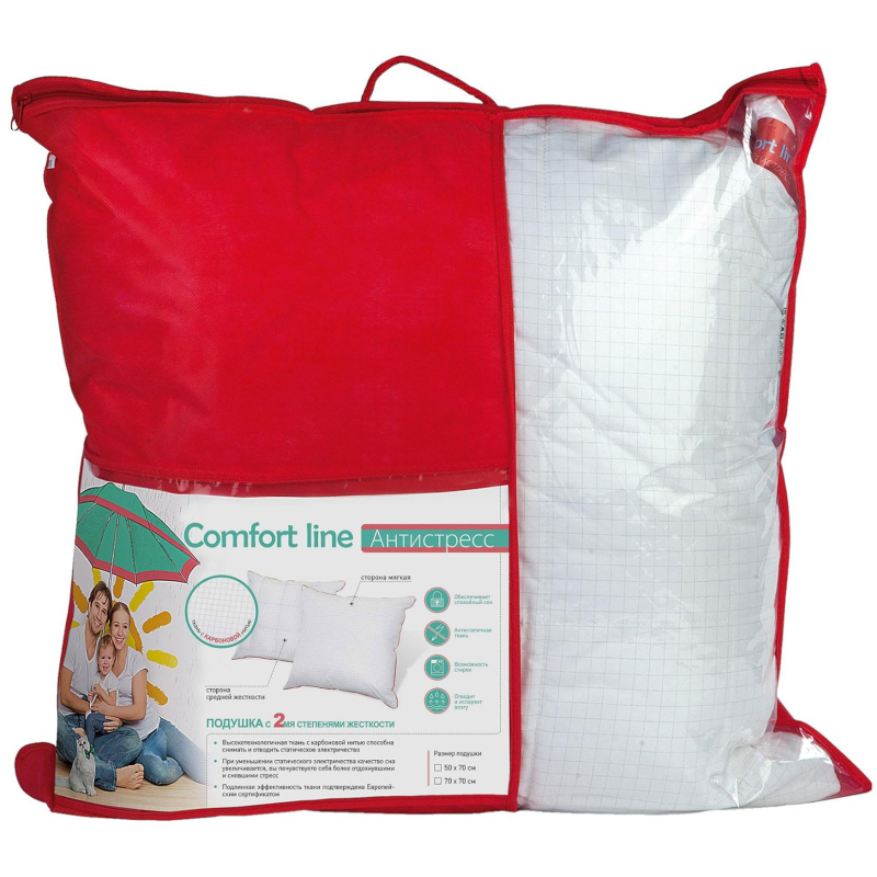 Подушка Comfort Line 70х70 см полиэстер/ткань антистресс. Гипоаллергенная подушка Comfort Line Antistress обеспечит оптимальный комфортный сон. Кант по периметру является дополнительным каркасом, который не позволяет подушке деформироваться, что делает ее идеальной для ежедневного использования. Удобная квадратная форма дарит еще больше комфорта и отдыха. Инновационная ткань с карбоновой нитью способна снимать и отводить излишки статического электричества. При этом улучшается качество сна, уходит стресс, Вы чувствуете себя отдохнувшим. Благодаря ткани изделия легко стирать, они износоустойчивые, идеально подходят для качественного комфортного сна. Рекомендации по уходу: стирка 1 раз в год при деликатном режиме и температуре воды не выше 40 градусов. Отжим при минимальных оборотах. Тщательная сушка. Размер изделия: 70х70 см. Вес изделия: 830 г. Упаковка: сумка ПВХ с ручкой.