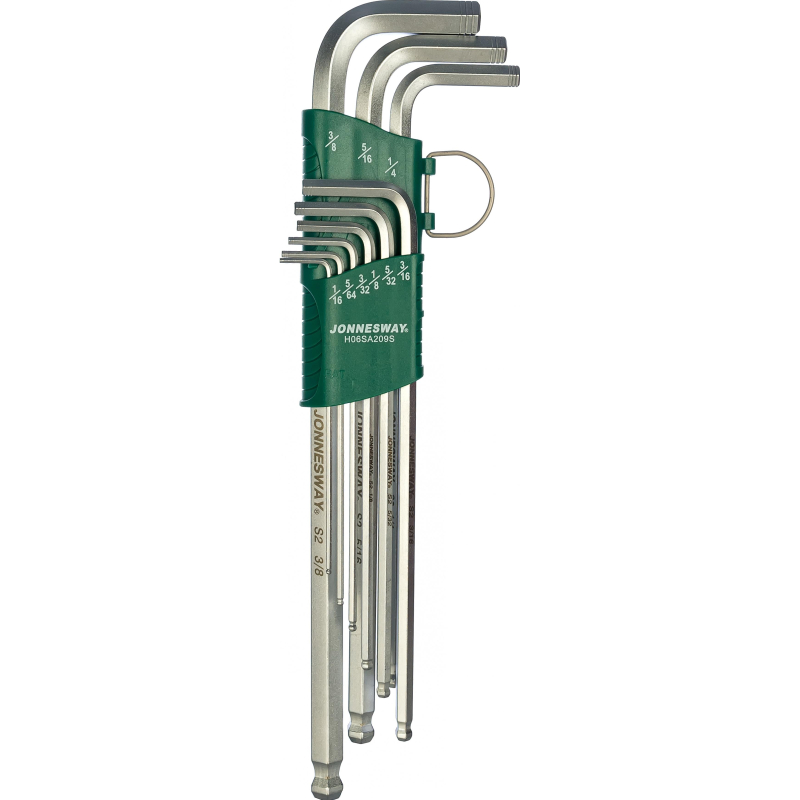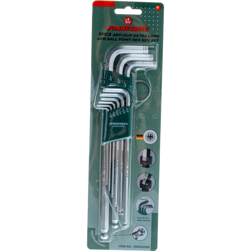 Набор ключей торцевых шестигранных удлиненных с шаром дюймовых, 9 предметов. Согнутый под углом 90° стержень с рабочими профилями одного размера на обоих концах, сочетает в себе относительное удобство использования с возможностью приложения значительных рабочих нагрузок, когда в качестве ручки используется длинная часть и работу в труднодоступных местах, когда в качестве воротка используется короткая. Комплект угловых шестигранников дюймовых сверхдлинных "H06SA209S" изготовлен из стали S2, имеет матовое хромоникелевое покрытие. Наличие шарового наконечника на длинной части инструмента позволяет дополнительно использовать инструмент под углом до 20° к оси вращения крепежной детали. Внешний вид и/или характеристики товара могут быть изменены производителем в соответствии с производственным процессом.