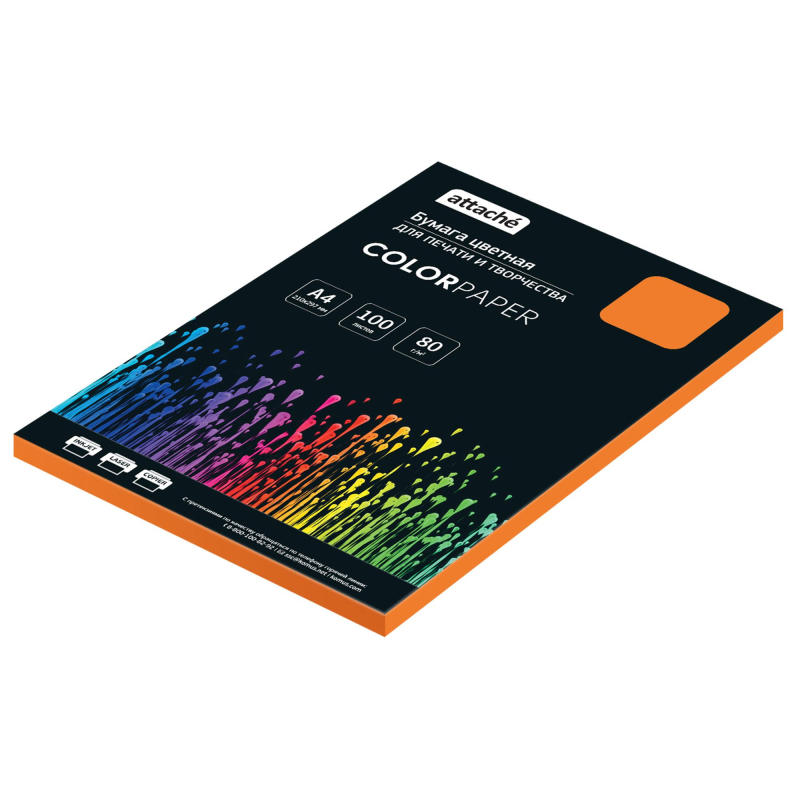 Бумага цветная Attache (оранжевый интенсив) предназначена для печати на всех видах принтеров. Одна пачка содержит 100 листов формата А4, плотность которых составляет 80 г/кв.м. Цветопередача монитора может искажать реальный цвет продукта.