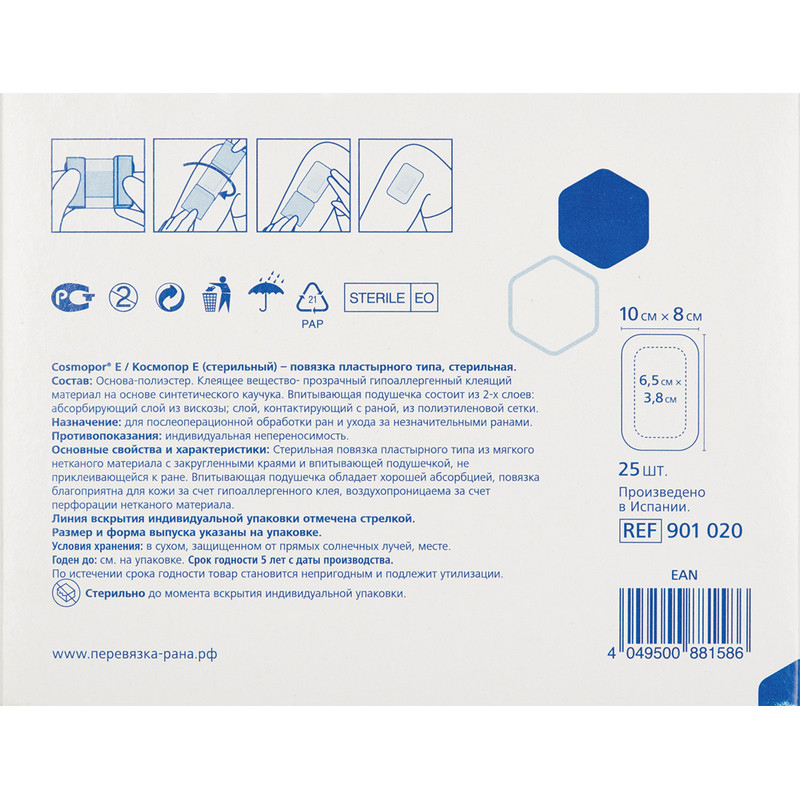 COSMOPOR E/Космопор Е- Самоклеящиеся послеоперац. повязки: 10 х 8 см; 25 шт. Для ухода за послеоперационными ранами, а также для стерильного ухода при незначительных повреждениях кожи Самоклеящаяся повязка на рану из мягкого нетканого материала со специальной не приклеивающейся к ране впитывающей подушечкой; хорошая сорбционная способность и защитные свойства; благоприятна для кожи за счёт гипоаллергенных свойств синтетического каучукового клея. Стерильно, запечатано поштучно