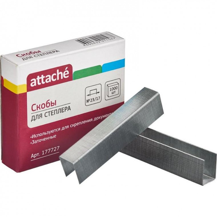 Скобы для степлера № 23/17 Attache предназначены для степлеров со сшивающей способностью от 130 до 160 листов (для бумаги толщиной 0,07 и 0,08 мм). Скобы № 23/17 выполнены из металла с цинковым покрытием. 1000 скоб в картонной пачке. В промежуточной упаковке — 10 пачек по 1000 скоб.