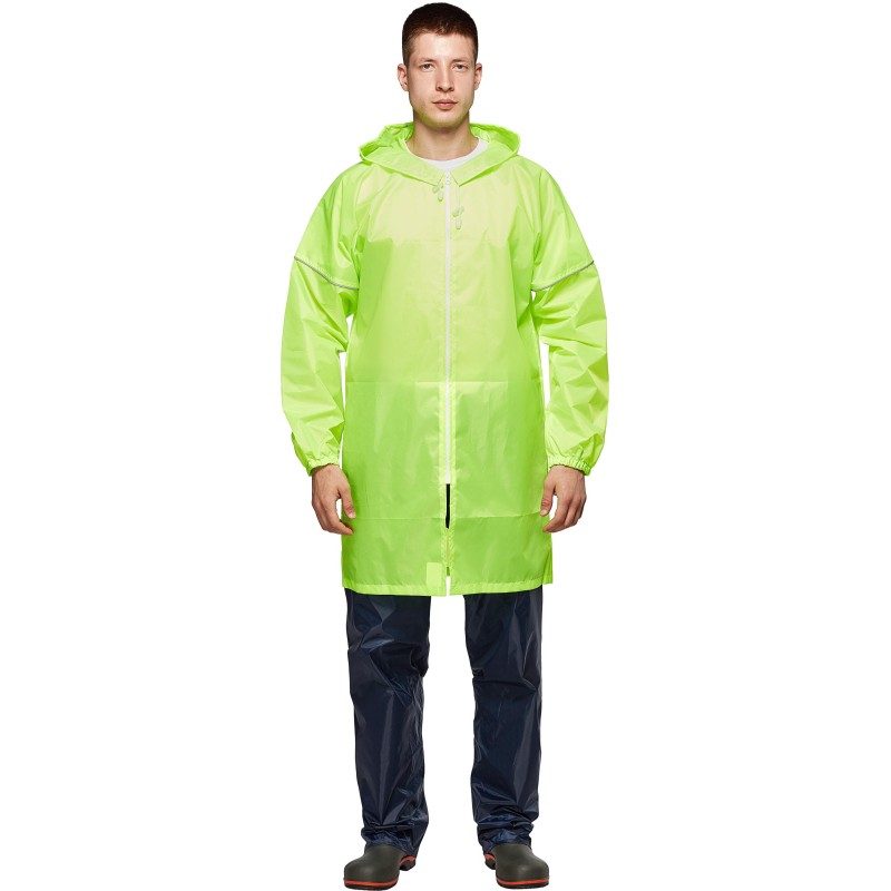 Плащ влагозащитный Ивент Блик на молнии желтый с СОП (размер 52-54, L, рост 182-188). Плащ-дождевик Ивент Блик флуоресцентно-желтого цвета с центральной застежкой на молнии и капюшоном. Изделие обеспечивает безопасность в условиях плохой видимости, защиту от ветра, дождя и снега, общих загрязнений во время работы и активного отдыха на открытом воздухе. Плащ-дождевик прямого силуэта. Капюшон двухшовный, по отлету капюшона кулиса, в которую продет шнур с фиксатором. Рукава цельнокроеные с притачными манжетами. В швах капюшона и притачивания манжет рукавов - светоотражающие канты. Проклеенные швы капюшона и горловины.