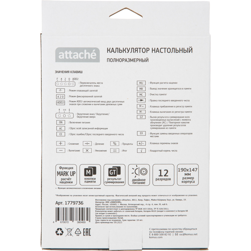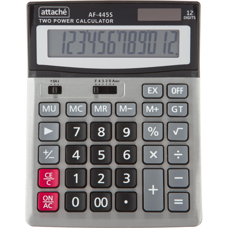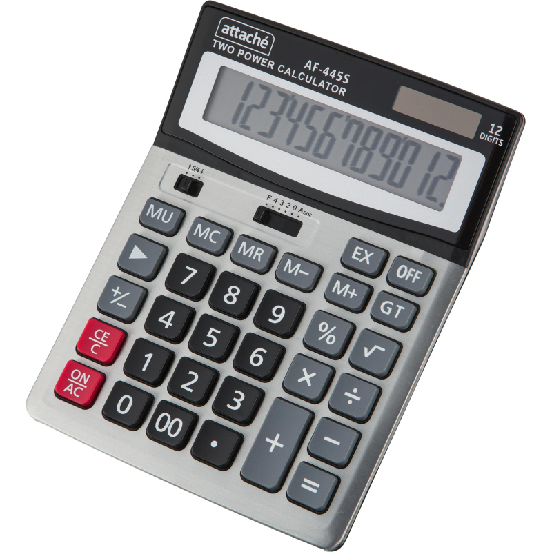 Калькулятор Attache полноразмерный настольный AF-445S настольный с 12-разрядным дисплеем. Эргономичная форма металлической панели и крупные клавиши создают максимальный комфорт в использовании. Корпус изготовлен в сером цвете с кнопками и дисплеем черного цвета. Оптимальный и необходимый набор функций, среди которых: расчет процентов, вычисление квадратного корня, независимая память (М+, М-, МRC). Функция вычисления налога: нет. Функция коррекции вычислений: нет. Наклонный дисплей: нет. Большой двенадцатиразрядный дисплей отображает большие значения с высокой точностью округления. В калькуляторе имеется три источника питания: круглая батарейка (входит в комплект и установлена внутри калькулятора), место для батарейки типа АА и солнечная батарея. Размер калькулятора: 190x147x41 мм. Материал клавиатуры: пластик. Вес: 0.19 кг. Число строк дисплея: 1. Цвет: серо-черный. Гарантийный срок: 18 месяцев.