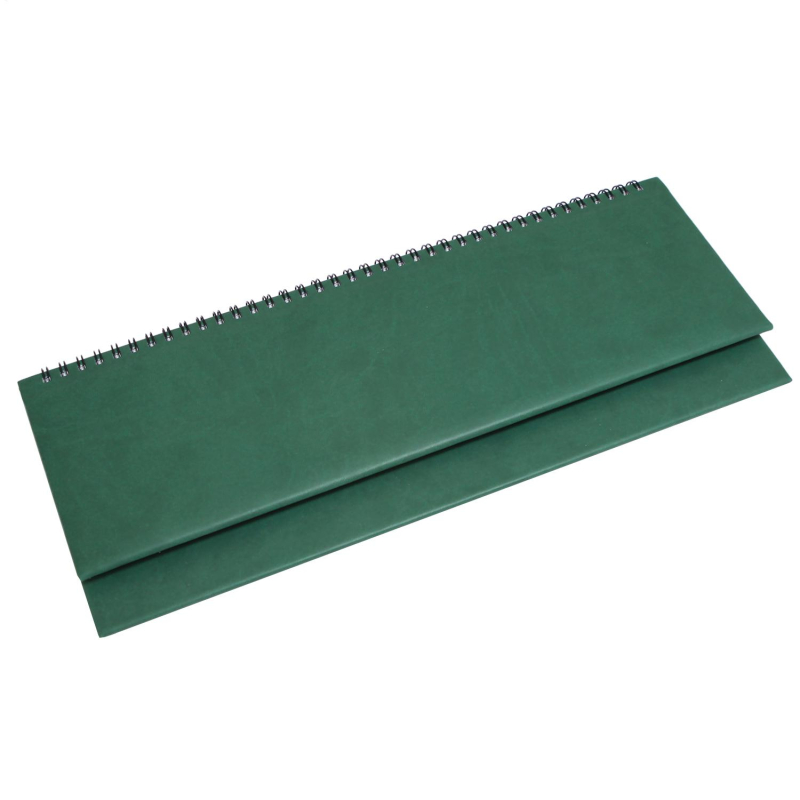 Формат: 340х130мм. Цвет: зеленый. Блок 110 страниц (55 листов) в 2 краски. Бумага офсетная 70гр/м2. Календарь на 2024-2025гг. Вырубка блока по месяцам. Твердая обложка выполнена из искусственной кожи высокого качества. Возможно нанесение логотипа на обложку, любым способом тиснения (блинт или фольга).