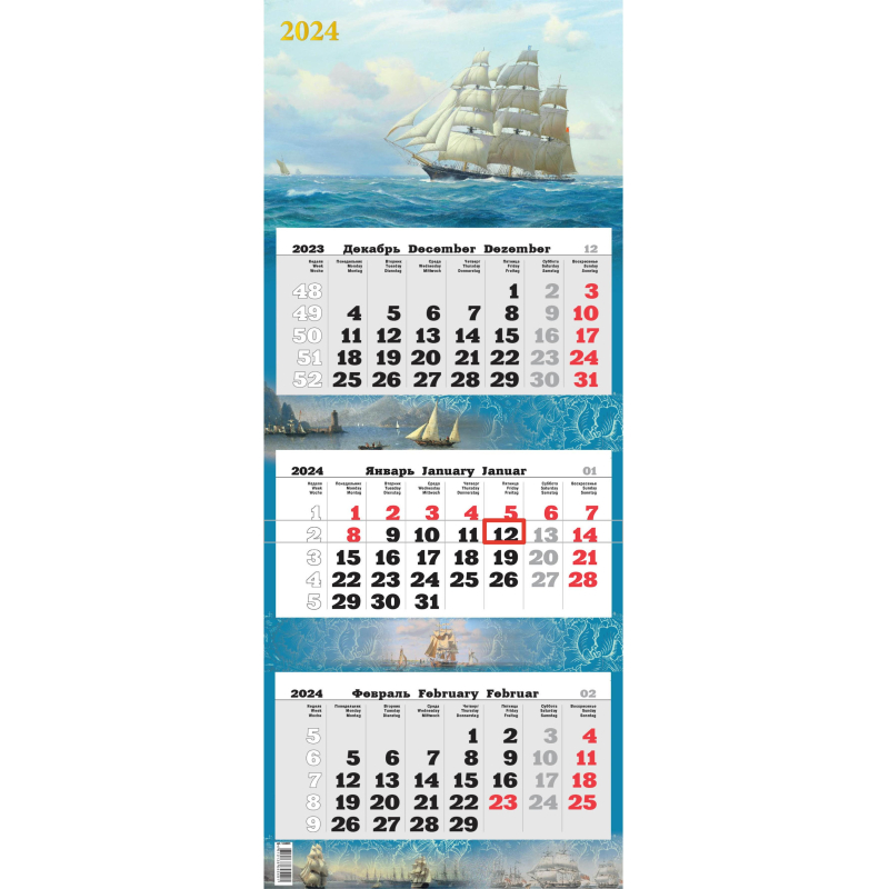 Календарь настен,2024,ПРЕМ ТРИО Парусник,офс,340х840,1224003