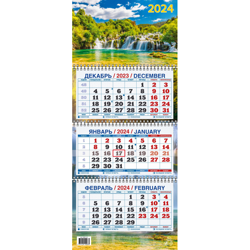 Календарь настен,2024,33 водопада,3 спир,офс,195х465,КМ01-24