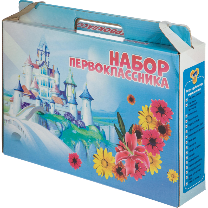 Набор первокласника в картонной коробке для девочки. В наборе 16 предметов: 1. подставка для книг 2. настольное покрытие для творчества 3. веер гласные 4. веер согласные 5. фартук для труда 6. нарукавники для труда 7. линейка первокласника 8. тругольник 9. транспортир 10. трафарет-раскраска 11. закладка 12. счетные палочки 13. папка на молнии А5 14. стакан-непроливайка 15. палитра художника 16. сумка для сменной обуви
