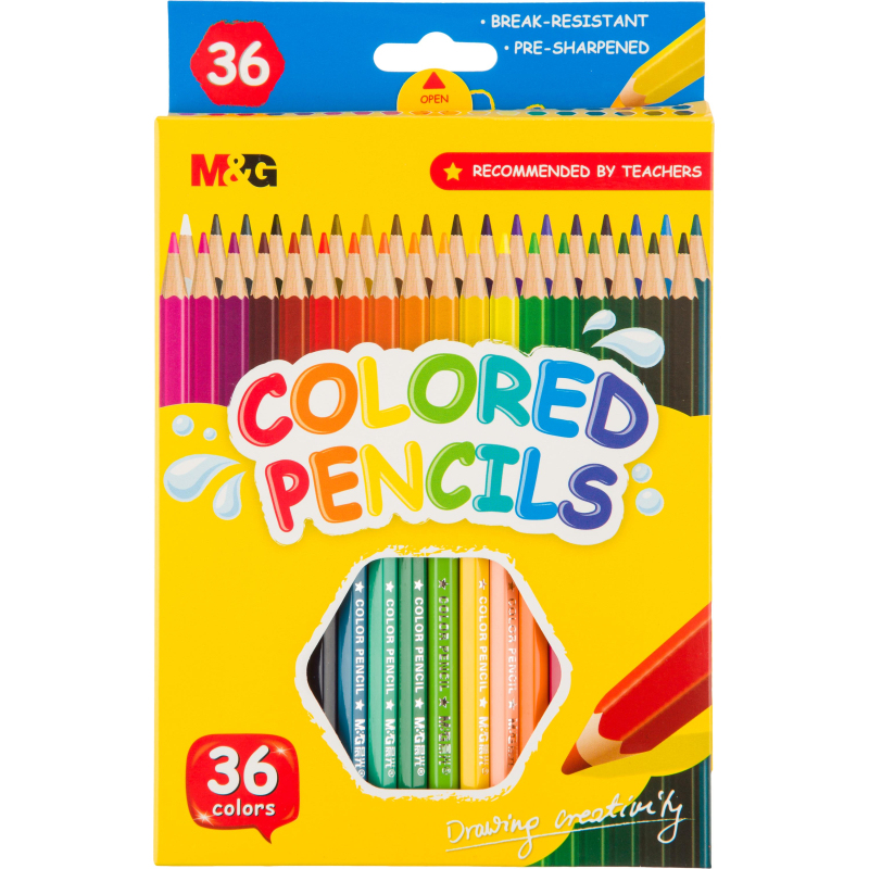 Карандаши цветные M&G, заточенные, для рисования, письма и раскрашивания на бумаге. Идеально подходят для детей и студентов, а также взрослых, которым нравится заниматься творчеством. 36 ярких и насыщенных цвета. Изготовлены из качественной древесины, ударопрочные и легко затачиваются, не оставляя заусенцев. Форма карандаша шестигранная, что позволяет правильно располагать пальцы. Упакованы в картонную коробку 130x180x16 мм.