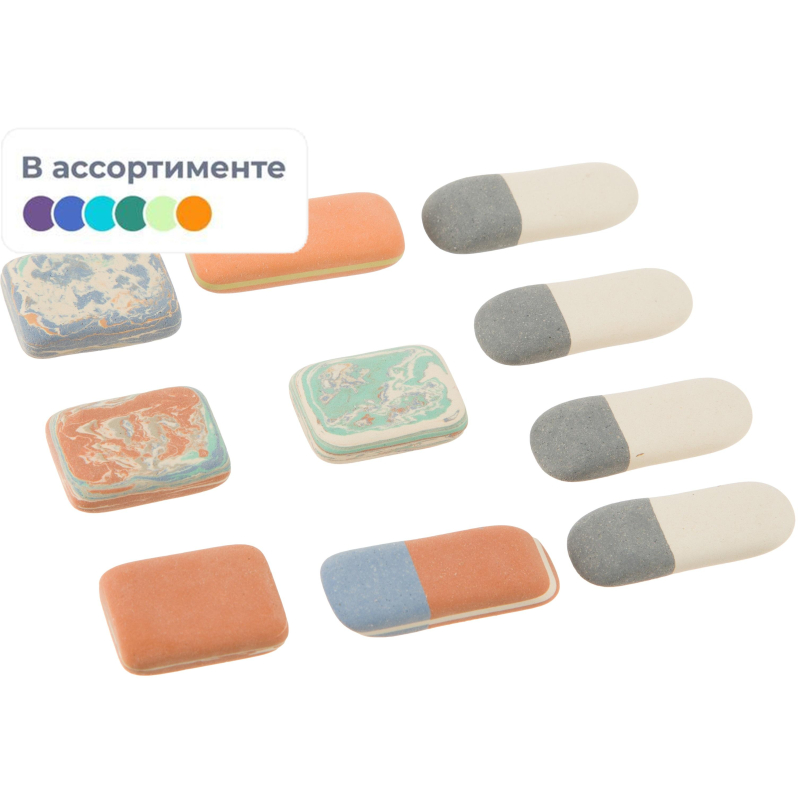 В набор ластиков входят различные типы ластиков для стирания графитовых и пастельных линий, чернильных пятен и индийских чернил с бумаги. Ластики изготовленных из сырья на натуральной основе, без добавления пластика и фталатов. Для детей старше трех лет.