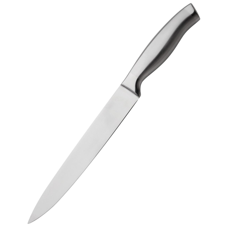 Нож кухонный Luxstahl Base line универсальный лезвие 20 см (кт042). Универсальный нож с лезвием длиной 20 см подходит для резки, рубки и шинковки овощей, фруктов, мяса и рыбы. Устойчивого к температурным воздействиям. Материалы ножа гигиеничны: не впитывают запахи, не создают условий для микробов и легко моются. Нержавеющая сталь лезвия обладает большой механической выносливостью, легко поддается заточке, долго сохраняет остроту. Нож используют, раскачивая его на разделочной доске сверху вниз, благодаря чему рез получается аккуратным, ровным и тонким.