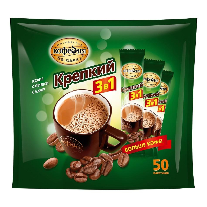 Напиток кофейный растворимый "Московская кофейня на паяхъ" - крепкий насыщенный вкус. Понравится тем, кто ищет не слишком сладкий кофе 3 в 1. Кофейный напиток обладает насыщенным вкусом и чудесным бодрящим ароматом. Удобная упаковка в форме порционных пакетиков позволит насладиться восхитительным кофейным ароматом и насыщенным вкусом кофе, где и когда удобно. Состав: Сахар, заменитель сухих сливок (патока крахмальная, масло пальмовое, казеинат натрия, эмульгатор, стабилизатор, пищевая добавка), кофе натуральный растворимый "Московская кофейня на паяхъ", соль, ароматизатор. Степень обжарки / вид кофе: средняя обжарка. Способ приготовления: высыпать содержимое пакетика в чашку, залить 150 мл горячей, но не кипящей воды, размешать. Вес: 800 г. Количество пакетиков в упаковке: 50 штук. Тип упаковки: вакуумный пакет. Условия хранения: При температуре до 20 °С, с относительной влажностью воздуха не более 75%. Страна производства: Россия.