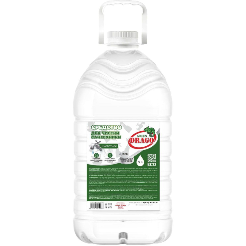 Средство для уборки санитарных помещений Green Drago 5 л (концентрат). Назначение: Торговые и деловые центры, медицинские, образовательные, научные, финансовые, спортивно-оздоровительные, культурно-досуговые и иные учреждения, организации общественного питания, предприятия промышленности, гостиницы и вокзалы, все виды транспорта, в быту. Свойства: Гелеобразный сильнокислотный низкопенный готовый к применению препарат, непрозрачный голубого цвета с ароматом альпийской свежести, против ржавчины, известковых отложений, мочевого и мыльного камня, др. загрязнений на нержавеющей стали, алюминии и цветных металлах, пластиках, кафеле и др. керамике, никелированных, хромированных и др. поверхностях. Препятствует образованию грязевых подтеков. Легко смывается. Пожаро и взрывобезопасный. Замерзает, после размораживания свойства сохраняются. Способ применения: Нанести на поверхность (для унитаза - под и на ободок) и равномерно распределить гель, через 5-10 мин растереть (при необходимости) и смыть водой. При необходимости обработку повторить. Примечание с алюминиевых, из цветных металлов, хромированных и никелированных поверхностей смывать сразу. Состав: вода, кислота, загуститель, ИПС, ПАВ, краситель, ароматизатор. Плотность: 1,04+0,05 г/см? при 20°С. Значение pH 1%-раствора 2,5+0,5. Предупреждающие меры опасно беречь от детей. Применять строго по назначению указанными способами. При работе использовать резиновые перчатки, защитные очки и спецодежду. Избегать проглатывания, попадания на кожу и в глаза. При попадании на кожу или волосы промыть водой, в глаза - осторожно промывать водой несколько минут, обратиться к врачу.Не использовать на эмалированных и акриловых поверхностях. Хранение плотно закрытым в заводской упаковке в темном сухом недоступном детям и животным месте отдельно от пищевых продуктов и кормов, а также щелочных и хлорсодержащих препаратов. Срок годности: 3 года от даты изготовления (при соблюдении условий транспортировки и хранения).