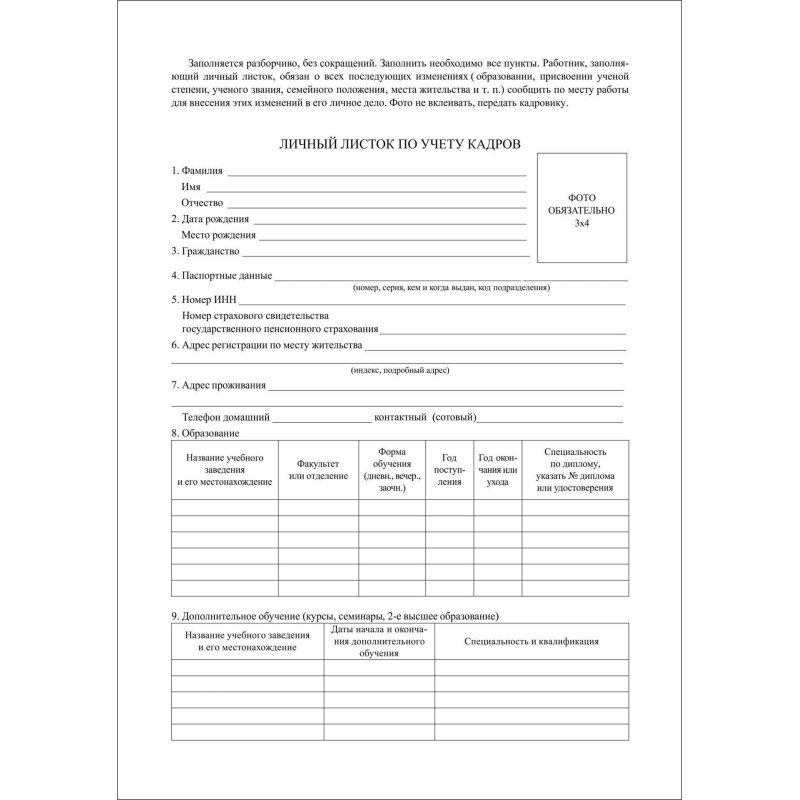 Бланк Личный листок по учету кадров офсет КЖ-925, 100шт/уп