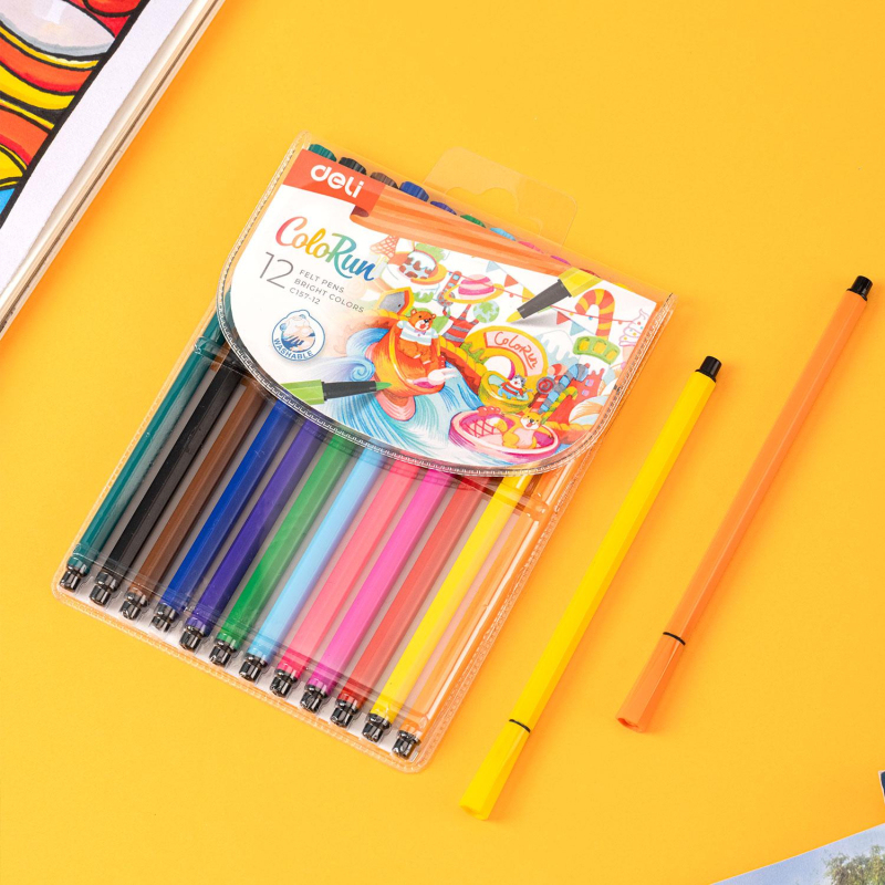 Фломастеры Deli для рисования, дизайна, раскрашивания или для художественных проектов. Сделать свой рисунок ярче и интереснее - легко. Нужно просто выбрать нужные фломастеры. Благодаря яркому дизайну с мультяшными персонажами, рисование превращается в веселое увлекательное занятие. Deli ColoRun - это гарантия ярких насыщенных цветов, а эргономичная шестигранная форма корпуса создаст дополнительный комфорт при длительном рисовании. Пулевидный наконечник мягко скользит по поверхности бумаги, оставляя яркую четкую контрастную линию. Благодаря использованию специальных чернил на водной основе, фломастеры является нетоксичными. Легко смываемый водой состав, облегчает чистку и стирку вещей, при случайном попадании на одежду. Чернила также легко удаляются теплой водой с кожи, деревянных и кожаных поверхностей. Идеально подходят для маленьких детей от 3-х лет. Цвета фломастеров соответствуют естественным природным цветам, что положительно влияет на формирование правильного цветового восприятия, развитие творческих способностей ребенка. В набор входит 12 фломастеров с вентилируемыми колпачками в упаковке 172x132x9 мм с европодвесом. Вентилируемый колпачок обеспечивает безопасность для ребенка (не перекрывает доступ кислорода в случае попадания колпачка в дыхательные пути). Прекрасно подойдет детям в подарок на день рождения, на праздник, утренник.
