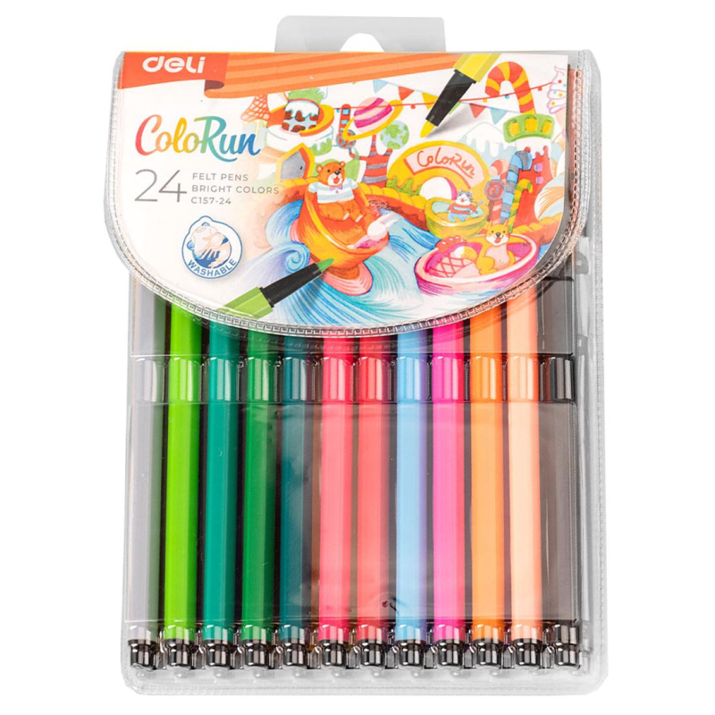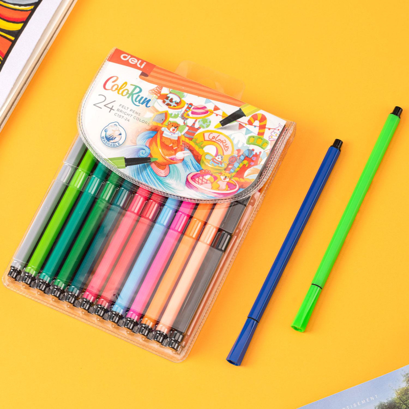 Фломастеры Deli для рисования, дизайна, раскрашивания или для художественных проектов. Сделать свой рисунок ярче и интереснее - легко. Нужно просто выбрать нужные фломастеры. Благодаря яркому дизайну с мультяшными персонажами, рисование превращается в веселое увлекательное занятие. Deli ColoRun - это гарантия ярких насыщенных цветов, а эргономичная шестигранная форма корпуса создаст дополнительный комфорт при длительном рисовании. Пулевидный наконечник мягко скользит по поверхности бумаги, оставляя яркую четкую контрастную линию. Благодаря использованию специальных чернил на водной основе, фломастеры является нетоксичными. Легко смываемый водой состав, облегчает чистку и стирку вещей, при случайном попадании на одежду. Чернила также легко удаляются теплой водой с кожи, деревянных и кожаных поверхностей. Идеально подходят для маленьких детей от 3-х лет. Цвета фломастеров соответствуют естественным природным цветам, что положительно влияет на формирование правильного цветового восприятия, развитие творческих способностей ребенка. В набор входит 24 фломастеров с вентилируемыми колпачками в упаковке 195x132x19 мм с европодвесом. Вентилируемый колпачок обеспечивает безопасность для ребенка (не перекрывает доступ кислорода в случае попадания колпачка в дыхательные пути). Прекрасно подойдет детям в подарок на день рождения, на праздник, утренник.