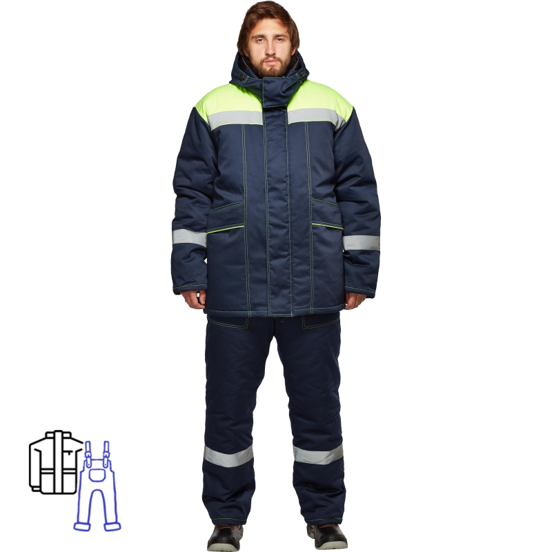Костюм рабочий зимний мужcкой модели з45-КПК выполнен в синем и лимонном цветах. Состоит из куртки и полукомбинезона. Цвет отделочных ниток выполнен в тон отделки, в том числе и в швах подгибки низа куртки, рукавов и ПК. Размер 64-66, рост 182-188. Костюм изготовлен из смесовой ткани - 65% полиэстер, 35% хлопок. Плотность ткани - 200 г/м2. Материал подкладки - таффета. Застежка выполнена в виде молнии. Класс зашиты - 3(4) от пониженных температур. Класс риска - 1. Климатический пояс - 3. Куртка утепленная (3 слоя синтепона 150 г/м2) прямого силуэта с центральной застежкой на тракторную 2-х замковую тесьму молнию, закрытую ветрозащитной планкой, застегивающейся на 3 контакта текстильной ленты, с отложным воротником из искусственного меха, и съемным капюшоном. Полочки на кокетке с отрезными центральными частями и двумя нижними утепленными карманами в швах с клапаном, по низу которого выполнен кант со стороны нижнего клапана. На левой полочке подкладки расположен накладной карман из основного материала, одна сторона которого входит в шов притачивания подборта, застегивающийся на один контакт. На нем расположена нашивка ФИО. Спинка на кокетке с кулисой. Рукав втачной, двушовный (2 слоя синтепона 150 г\м2) с трикотажными напульсниками по низу. Воротник отложной меховой с патой, застегивающейся на 1 петлю и пуговицу. Капюшон (1 слой синтепона 150 г\м2) с ветрозащиткой с центральной частью съемный, пристегивающийся на 5 петель и пуговиц к куртке - по объему должен одеваться на каску. Расширенная подбородочная часть застегивается на 2 контакта текстильной застежки (крест накрест). На центральной части расположена пата, застегивающиеся на 1 контакт текстильной застежки. Полукомбинезон на утепляющей подкладке (2 слоя 150 г/м2), с центральной застежкой на 2-х замковую тесьму - молния, с накладными боковыми карманами. На спинке кулиса с эластичной лентой. Бретели регулируются спереди при помощи фастексов, а сзади скрытой эластичной лентой. Отделочные строчки: - 0,1-0,2 см и 0,5-0,7 см (двухъигла) проложена по отлетным сторонам клапанов, для настрачивания накладных карманов верха изделия, по швам соединения деталей полочек, для отстрачивания отлетных краев ветрозащитного клапана, по локтевому шву, по среднему шву задних половинок ПК, по шву притачивания грудки ПК, по верхнему краю грудки и спинки ПК. - 0,1-0,2 см для настрачивания СОП, по лицевому краю капюшона, для настрачивания карманов подкладки и контактной ленты, по краям бретелям ПК, по средней части капюшона, по трем сторонам пат. - 0,5-0,7 см от края, проложены: по краю борта куртки. Особенности модели: 1. Куртка по линии талии спинки, по лицевому краю капюшона, регулируется шнуром и двухшнурными фиксаторами (на капюшон - 2-мя фиксаторами, на талии - одним). На капюшоне шляпная резинка выходит через люверсы, а на талии через обметанную петлю. По низу куртки выполнена кулиса, по бокам выходит через люверсы, двухшнурные фиксаторы и петлю. 2. Кокетки полочек и спинки, центральная часть капюшона, нижние клапаны карманов куртки выполнены из ткани отделочного цвета. 3. СОП 50 мм проходит по низу кокеток полочки и спинки с образованием канта, по низу рукавов и полукомбинезона. 4. Между верхом и утеплителем проложен слой спанбонда. 5. Подкладку на капюшоне, подкладку вверху и внизу проймы необходимо крепить держателями с тканью верха. В данной модели им