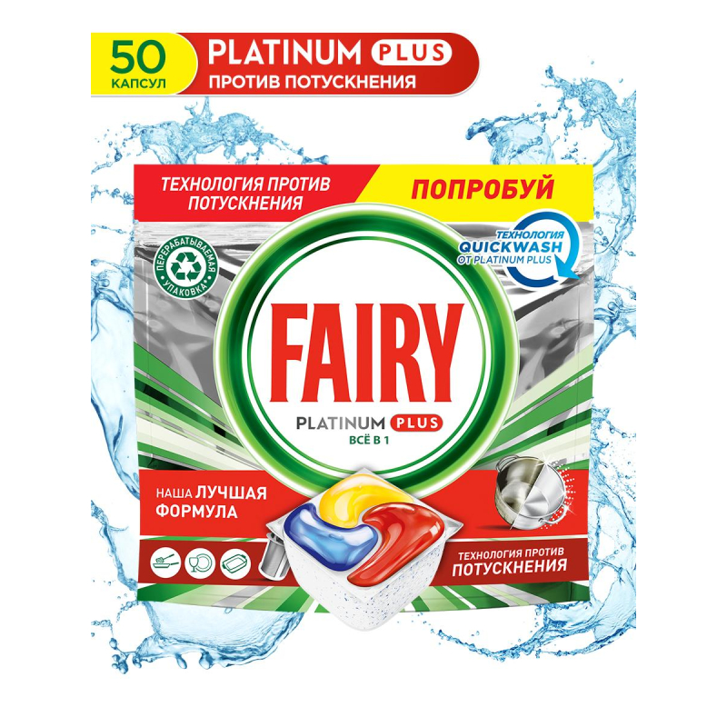 Капсулы для посудомоечных машин Fairy Platinum Plus All in 1 (50 штук в упаковке). Назначение: Новый подход к повседневным бытовым задачам - капсулы для посудомоечной машины Fairy Platinum Plus Все В 1 с лимоном. Эти таблетки, созданные специально для автоматического мытья посуды, справляются даже со сложными загрязнениями. Вас порадует двойной эффект от применения средства - удаление стойких загрязнений и устранение налета на посуде. Капсулы Platinum Plus All in 1 не содержат фосфатов, что благоприятно воздействует на механизм посудомоечных машин. А входящие в состав соль, ополаскиватель и очиститель обеспечивают защиту стеклянной посуды и столового серебра. Все, что нужно для мытья посуды и ухода за посудомоечной машиной, в 1 капсуле. Особенности использования капсул: - ИДЕАЛЬНАЯ ЧИСТОТА. Многокамерные таблетки удаляют даже въевшиеся остатки пищи, пригоревший жир. - БЫСТРО РАСТВОРЯЮТСЯ. Подходят для использования на коротких циклах мойки. - ЗАЩИТА ОТ ПОТУСКНЕНИЯ. Формула с технологией против потускнения посуды. - СОХРАННОСТЬ ПОСУДОМОЙКИ. Специальная формула предотвращает накопление жира на фильтре, системе спуска и разбрызгивателе посудомоечной машины. Ведущие производители посудомоечных машин рекомендуют использовать капсулы 'Фейри'. В упаковке 50 капсул, рассчитанных на соответствующее количество циклов мытья посуды. Способ применения: 1 капсула = 1 загрузка. Поместите капсулу в отсек для моющего средства и сразу закройте. Меры предосторожности: Вызывает серьезное повреждение глаз. Беречь от детей. ПРИ ПОПАДАНИИ В ГЛАЗА: осторожно промыть большим количеством воды в течение нескольких минут. Незамедлительно обратиться за медицинской помощью. Использовать защиту для глаз. ПРИ ПРОГЛАТЫВАНИИ: прополоскать рот не вызывать рвоту. Выпить небольшое количество воды. Содержит протеазу. Может вызвать аллергическую реакцию. Содержит перкарбонат натрия, тридецет-н. Состав: 5-15% неионогенные ПАВ, отбеливающие вещества на основе кислорода, поликарбоксилаты,