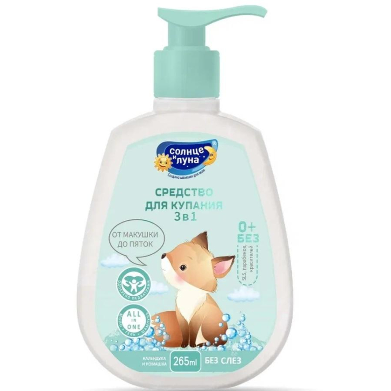 Универсальное детское средство для купания 3 в 1 подходит для бережного ухода за нежной кожей малыша с первых дней жизни. Мягкая формула способствует деликатному очищению с головы до пяток, не сушит кожу и не щиплет глазки. Ромашка оказывает мягкий антибактериальный эффект, увлажняет кожу и защищает от внешних воздействий. Календула оказывает противовоспалительное действие, успокаивает кожу и снимает раздражения. Средство можно использовать для ежедневного подмывания и купания детей, подходит для чувствительной кожи. Лисенок бренда Солнце и Луна готов стать помощником каждой заботливой маме на пути безопасного ухода за любимым малышом! Состав: Aqua, Sodium Laureth Sulfate, Magnesium Laureth Sulfate, Cocamidopropyl Betaine, Disodium Cocoamphodiacetate, Sodium Chloride, Cocamide DEA, Polyquaternium-7, Glycerin, Camomilla Recutita (Camomile) Flower Extract, Calendula Officinalis Flower Extract, DMDM Hydantoin, Methylchloroisothiazolinone, Methylisothiazolinone, Citric Acid, Parfum, 2-Na EDTA. Способ применения: Небольшое количество средства нанести на влажные волосы и тело, вспенить и смыть. Подходит для ежедневного применения.
