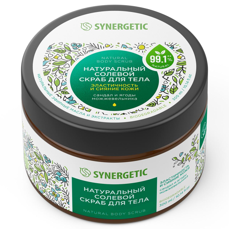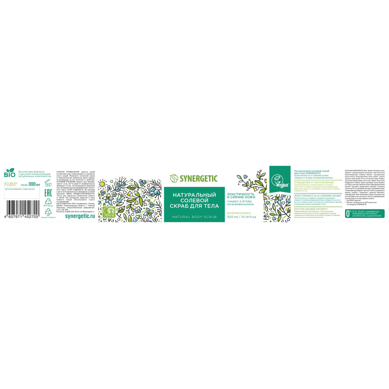 Натуральный солевой скраб для тела Synergetic эластичность и сияние кожи, сандал и ягоды можжевельника - это эффективное средство для ухода за кожей, более чем на 99% состоящее из натуральных компонентов. Скраб деликатно отшелушивает и очищает кожу. Масло карите оказывает регенерирующее действие, питает и увлажняет, делая кожу гладкой и бархатистой. Комплекс масел кокоса и сладкого миндаля оказывают мощное тонизирующее действие, придают эластичность и сияние коже. Экстракты сандалового дерева и можжевельника увлажняют кожу. Гипоаллергенная парфюмерная композиция разработана в швейцарском доме Givaudan. Аромат натурального скраба для тела SYNERGETIC с маслами пачули, ладанника, герани, гурьюнского бальзама и розового перца оставляет на коже восхитительный аромат. Натуральный скраб не содержит SLS, SLES, парабенов, силиконов, минеральных масел и красителей, а также компонентов животного происхождения, не тестируется на животных и сертифицирован британской организацией The Vegan Society. Способ применения. Нанести скраб на влажную кожу, помассировать и тщательно смыть водой. Возможно отсекание масла и незначительное изменение цвета скраба, не влияющие на его качество и свойства. Меры предосторожности. При попадании в глаза, промыть водой. Только для наружного применения. Хранить отдельно от еды. Состав: Sodium Chloride (соль), Glycerinx (увлажняющий компонент растительного происхождения), Cetearyl Alcoholx(натуральный загуститель), Butyrospermum Parkii Butterx (масло карите), Aqua (вода), Prunus Armeniaca Seed Powderx (молотая абрикосовая косточка), Sweet Almond Oil Polyglyceryl-4 Estersx (масло миндаля), Cocos Nucifera Fruit Oilx (масло кокоса), Santalum Album (Sandalwood) Wood Extractx (экстракт сандалового дерева), Juniperus Communis Fruit/Leaf Water (экстракт можжевельника), Cocamidopropyl Betainex (мягкий ПАВ из кокосового масла), Lecithinx, Tocopherolx, Ascorbyl Palmitatex, Hydrogenated Palm Glycerides Citrate (натуральный аниоксидантный комплекс), Parfum (парфюмерная композиция на основе эфирных масел). Хранить при температуре от +5 до +25 °С вдали от нагревательных приборов и огня. Не допускается хранение под непосредственным воздействием солнечного света. Срок годности: 36 месяцев с даты производства при соблюдении условий хранения.