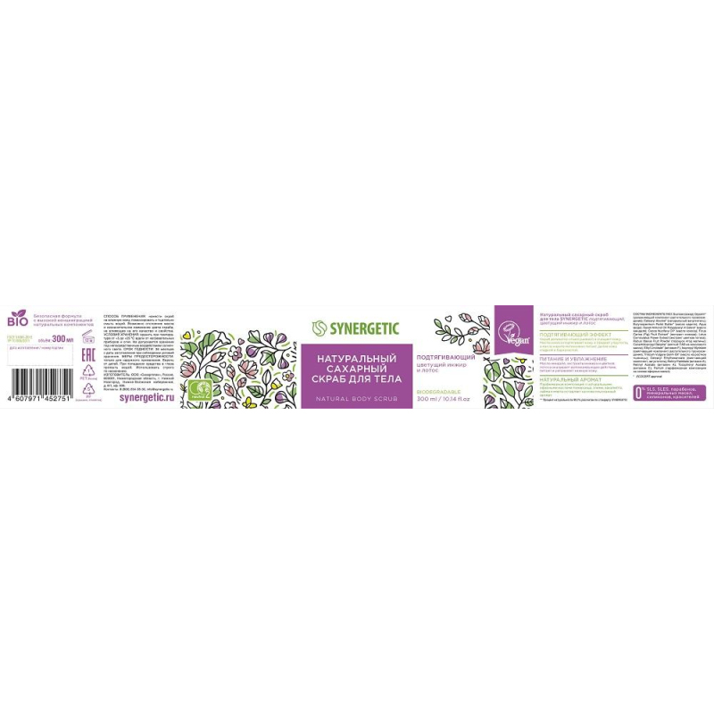 Натуральный сахарный скраб для тела Synergetic подтягивающий, цветущий инжир и лотос - это эффективное средство для ухода за кожей, более чем на 99% состоящее из натуральных компонентов. Скраб деликатно отшелушивает и очищает кожу. Масло кокоса подтягивает кожу и придает упругость, а масло карите интенсивно питает, делая кожу гладкой и бархатистой. Масло миндаля, экстракты инжира и цветков лотоса оказывают регенерирующее действие, питают и увлажняют нежную кожу. Гипоаллергенная парфюмерная композиция разработана в швейцарском доме Givaudan. Аромат натурального скраба для тела SYNERGETIC с маслами померанца, элеми, эвкалипта, лайма и мирта оставляет на коже изысканный аромат. Натуральный скраб не содержит SLS, SLES, парабенов, силиконов, минеральных масел и красителей, а также компонентов животного происхождения, не тестируется на животных и сертифицирован британской организацией The Vegan Society. Способ применения: Нанести скраб на влажную кожу, помассировать и тщательно смыть водой. Возможно отсекание масла и незначительное изменение цвета скраба, не влияющие на его качество и свойства. Меры предосторожности: При попадании в глаза, промыть водой. Только для наружного применения. Хранить отдельно от еды. Состав: Sucrose (сахар), Glycerinx (увлажняющий компонент растительного происхождения), Cetearyl Alcoholx (натуральный загуститель), Butyrospermum Parkii Butterx (масло карите), Aqua(вода), Sweet Almond Oil Polyglyceryl-4 Estersx (масло миндаля), Cocos Nucifera Fruit Oilx (масло кокоса), Ficus Carica (Fig) Fruit Extractx (экстракт инжира)x,Butylene Glycol, Nelumbo Nucifera Flower Extract (экстракт цветков лотоса), Rubus Idaeus Fruit Powder (порошок ягод малины), Cocamidopropyl Betainex (мягкий ПАВ из кокосового масла), Ethyl Linoleatex (Витамин F), Isopropyl Myristate (смягчающий компонент растительного происхождения), Triticum Vulgare Germ Oilx (масло из ростков пшеницы), Cetearyl Ethylhexanoate (смягчающий компонент, загуститель), Retinyl Palmitate (Витамин А), Retinyl Acetate (Витамин А), Tocopheryl Acetate, Parfum (парфюмерная композиция на основе эфирных масел). x ECOCERT approval Хранить при температуре от +5 до +25 °С вдали от нагревательных приборов и огня. Не допускается хранение под непосредственным воздействием солнечного света. Срок годности: 36 месяцев с даты производства при соблюдении условий хранения.
