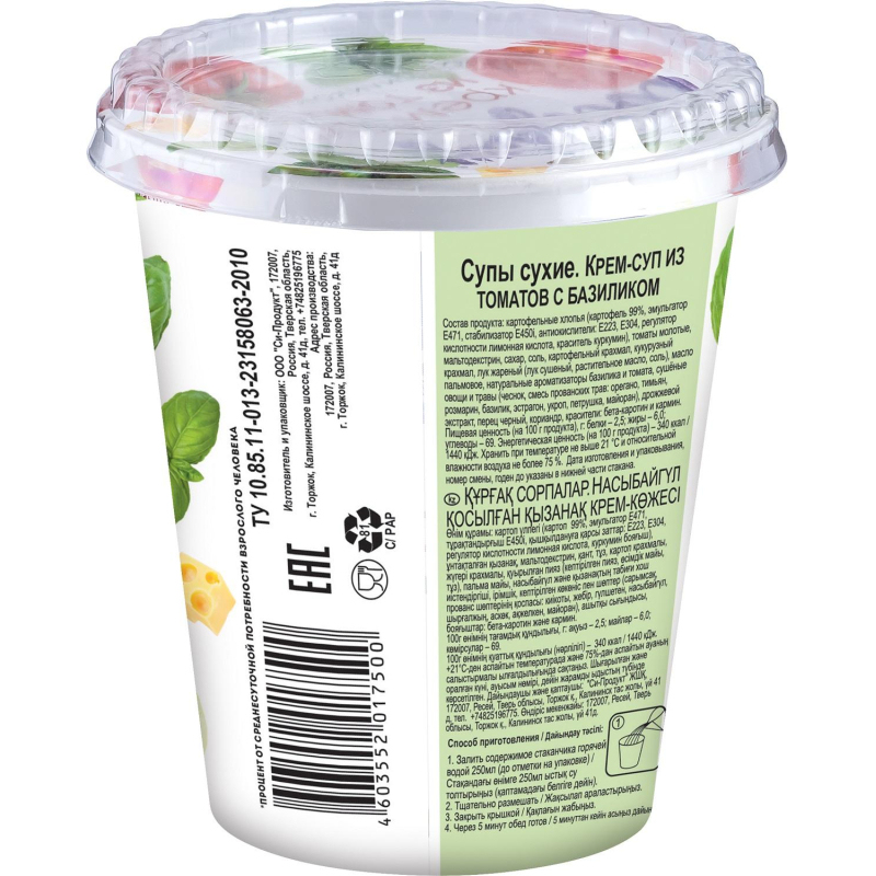 Крем-суп Everyday из томатов с базиликом в бумажных эко-стаканчиках. Супы - неотъемлемая часть сбалансированного рациона и нашей культуры питания. Сытное и одновременно легкое блюдо, придаст сил и наполнит энергией без ущерба для времени, готовый горячий обед всего за 5 минут! Удобный формат упаковки - саше, всегда можно иметь под рукой, не займет много места в дамской сумочке, в рюкзаке, в офисе, в машине. Длительное ощущение сытости и всего 96 калорий на готовую порцию - EVERYDAY помогает быть в форме! Томаты - один из главных источников ликопина - природного мощнейшего антиоксиданта, который защищает желудочно-кишечный тракт, укрепляет иммунитет, препятствует образованию 'плохого' холестерина. Вкус спелых, напитанных солнцем, томатов, душистый аромат базилика и нежная текстура крем-супа EVERYDAY порадуют даже самых требовательных гурманов. Крем-суп EVERYDAY - польза и вкус в каждой ложке! Состав: картофельные хлопья (картофель 99%, эмульгатор Е471, стабилизатор Е450i, антиокислители: Е223, Е304, регулятор кислотности лимонная кислота, краситель куркумин), томаты молотые, сахар, мальтодекстрин, соль, смесь на основе растительного жира (кокосовый жир, лактоза, глюкозный сироп, молочный белок, стабилизатор Е452, эмульгатор Е471, антислеживатель Е341), лук жареный (лук сушеный, растительное масло, соль), картофельный крахмал, кукурузный крахмал, сыр, сушеные овощи и травы (чеснок, смесь прованских трав: орегано, тимьян, розмарин, базилик, эстрагон, укроп, петрушка, майоран), дрожжевой экстракт, натуральные ароматизаторы базилика и томата, перец черный, кориандр, красители: бета-каротин и кармин. Пищевая ценность: углеводы - 58 г; жиры - 8.5 г; белки - 8 г; Энергетическая ценность: 330.0 Ккал Срок годности: 365 суток Условия хранения: при температуре не выше +21°С и относительной влажности воздуха не более 75% Вес: 830 г Страна производства: Россия