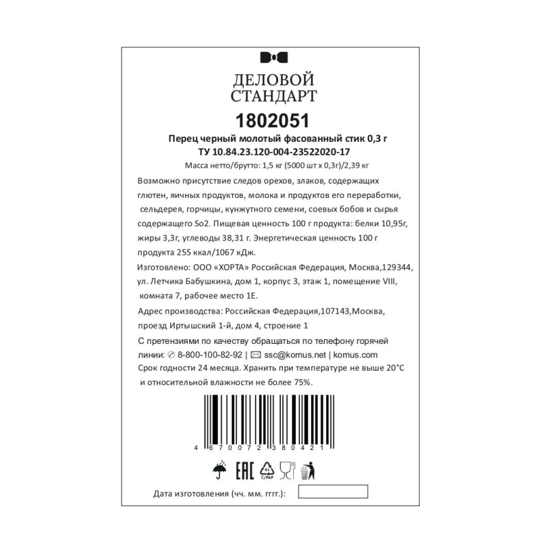 Перец черный молотый порционный расфасован по 0,3 грамма в порционные бумажные стики, позволяющие аккуратно дозировать продукт для употребления с готовыми блюдами. Имеет острый пряный вкус и яркий перечный аромат. Пищевая ценность на 100 г: белки - 10,95 г, углеводы - 38,31 г, жиры - 3,26 г. Энергетическая ценность 100 г - 255кКал/1067 кДж. В картонной коробке 5000 стиков. Срок годности: 24 месяца Условия хранения: в сухом месте при относительной влажности воздуха не более 75% и температуре не выше 20°С. Производитель: ООО ХОРТА. Страна производства: Россия.