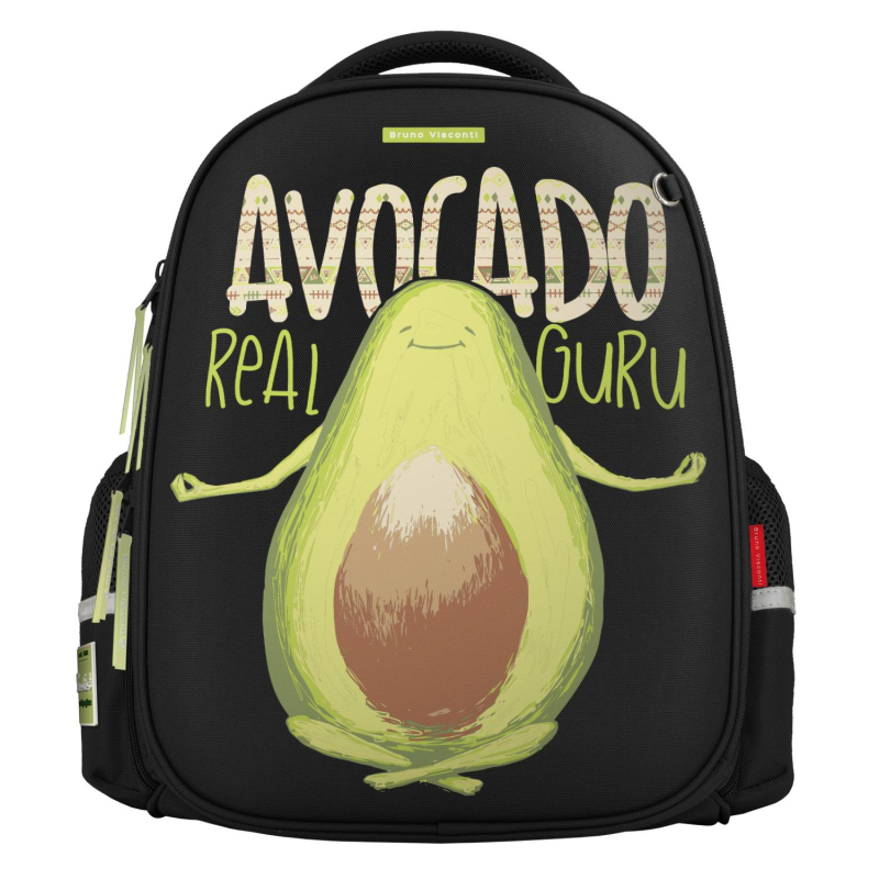 Рюкзак школьный "Avocado Style" ТМ Bruno Visconti имеет жесткий корпус: передняя и боковые стенки выполнены из усиленного материала, что обеспечивает эффект "капсулы". Для его производства использовалась ткань premium качества: водонепроницаемая, морозостойкая, с повышенной износостойкостью, грязеотталкивающая плотностью 900 DEN. Благодаря сложнейшим современным технологиям нанесения на ткань рюкзак украшает авторский дизайн, соответствующий последним трендам. Плотная фирменная подкладка Bruno Visconti идеально сочетается с дизайном и цветом самого рюкзака. Двунаправленные реверсивные надежные 8-мм молнии с 5-см пуллером на замках позволяют легко открывать и закрывать рюкзак. Комфорт и функциональность обеспечивают: - эргономичная, вентилируемая, с анатомическими подушечками спинка; - регулируемые лямки анатомической формы с застежкой на клипсе, дополнительно участвующие в правильном распределении веса рюкзака; - ручка-подвес из надежного материала, устойчивого к истиранию с усиленным креплением, выдерживающая большие нагрузки; - мягкая эргономичная ручка; - четыре светоотражающих элемента; - кольцо для брелока; - усиленное дно, оснащенное резиновыми ножками и защищающее от загрязнения дно рюкзака; - отделение с органайзером на молнии и карманом-сеточкой; - два боковых кармана для термоса или бутылки с водой; - отделение, состоящее из трех частей с двумя разделителями, фиксирующим ремнем и дополненное карманом на молнии для карточки. Размеры: 28х36х17 см, вес - 1040 г, объем - 17,1 л. Рюкзак определенно понравится как маленьким владельцам, так и их родителям.