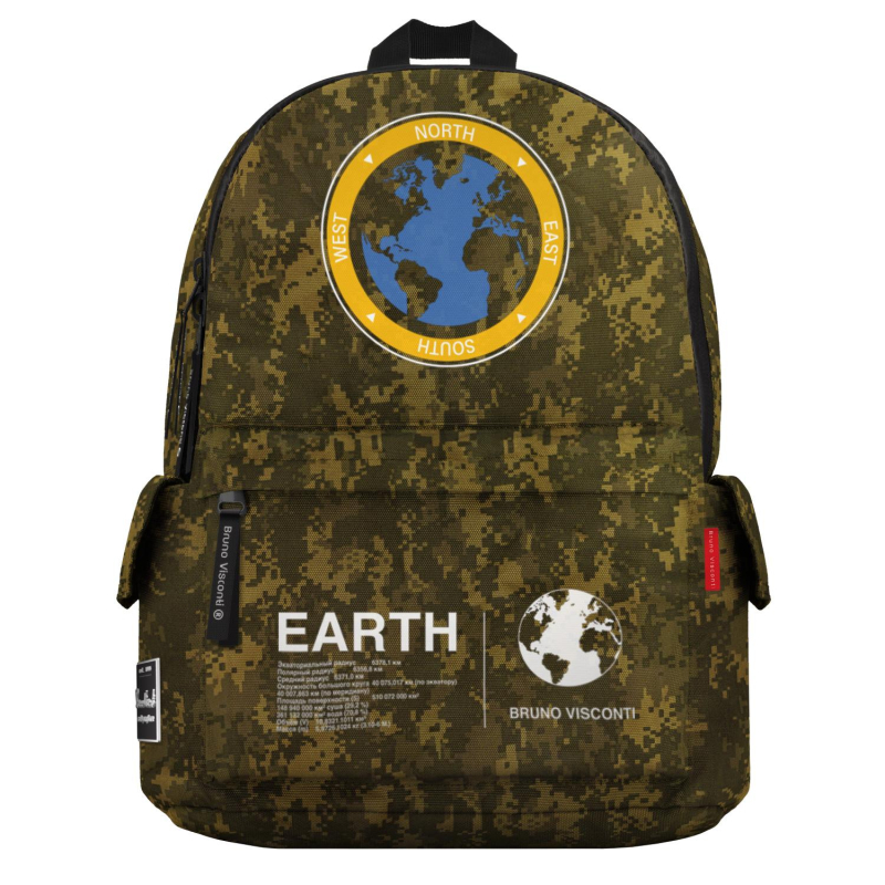 Рюкзак с авторским дизайном, с использованием сложнейших современных технологий нанесения на ткань. Ткань водонепроницаемая, морозостойкая, с повышенной износостойкостью, грязеотталкивающая. Водонепроницаемые двунаправленные-реверсивные надежные 10 мм молнии с 5 см пуллером на замках, что позволяет легко открывать и закрывать рюкзак. Мягкая, комфортная спинка выполнена также из водонепроницаемой ткани. Рюкзак снабжен ручкой-петлей. Регулируемые лямки прямые с усиленным креплением. Износостойкая фирменная подкладка Bruno Visconti, тщательно подобранная и сочетающаяся с дизайном и цветом рюкзака. Рюкзак имеет основное отделение, один фронтальный карман на молнии, два боковых с клапаном на кнопке, верхний карман на молнии для мелочей. Основное отделение снабжено карманом на молнии и двумя открытыми карманами, также отделение дополнено карманом на молнии для карточки. Размеры: 30х40х17 см, вес - 570 г, объем - 21 л.
