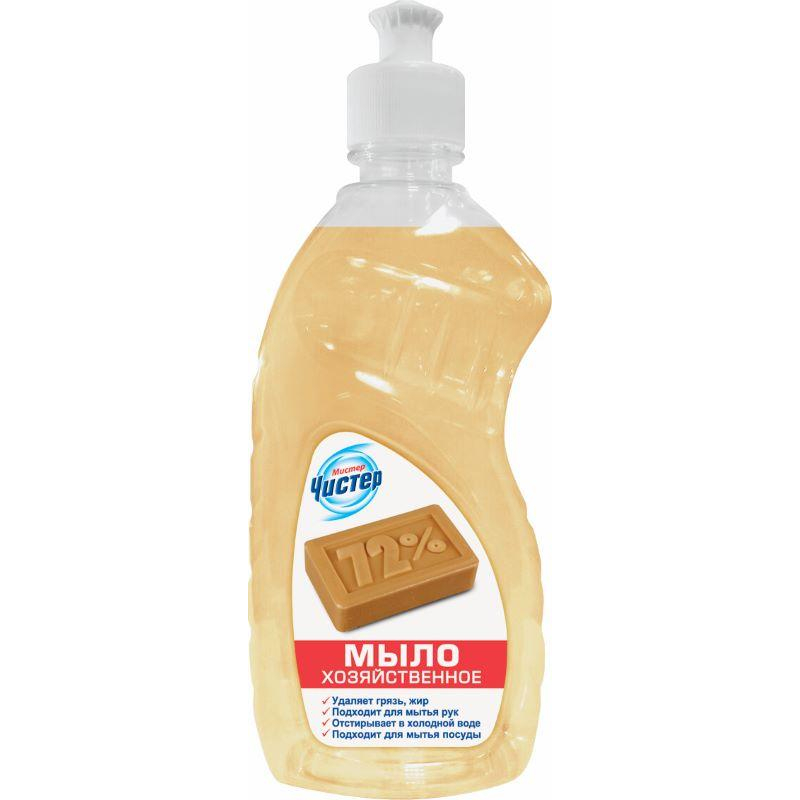 Мыло жидкое Мистер Чистер хозяйственное 450 мл. Назначение: Универсальное средство предназначено для мытья посуды, уборки, ручной стирки, а также для мытья рук. Удаляет жир и грязь, не остается на поверхности и посуде. Подходит для ручной стирки всех видов ткани, стирает даже в холодной воде. Экономно расходуется. Без хлора и парабенов. Способ применения: Мытье посуды: Нанести небольшое количество мыла на губку/посуду или растворить 10 мл средства в 2 литрах воды, вымыть, тщательно сполоснуть. Уборка пола и любых моющихся поверхностей: Растворить 30 мл мыла в 10 литрах воды или нанести небольшое количество мыла на губку (поверхность), вымыть, смыть водой. Ручная стирка: Растворить 75 мл мыла в 5 литрах мягкой воды и воды средней жесткости (для жесткой воды - 110 мл) с t 40-50 С, замочить белье на 10-15 минут, постирать, тщательно прополоскать в чистой воде. Мытье рук: Небольшое количество мыла нанести на влажную кожу рук, вспенить, тщательно смыть теплой водой. Состав: Вода, АПАВ (5-15%), НПАВ (