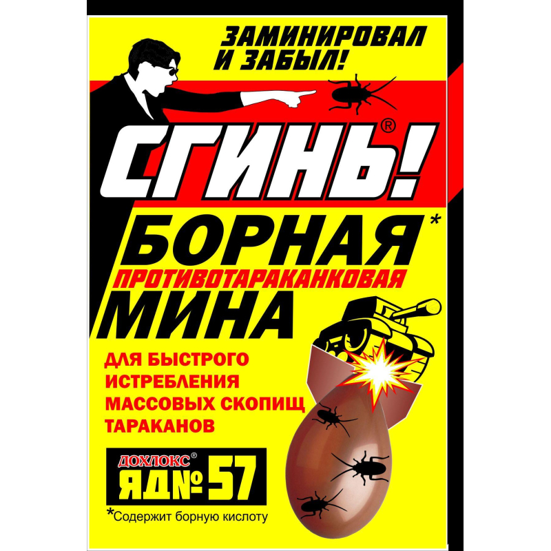 Средство от насекомых Дохлокс борная мина 60 г. Назначение: СГИНЬ! №57 Борная Мина от тараканов 1 шт. Самое эффективное средство от тараканов в категории 'Контейнеры с отравленной приманкой'. За короткое время уничтожают большие скопления тараканов. Сохраняют свою эффективность в течение 2-3 месяцев даже в самых грязных помещениях. Способ применения: Снять предохранительную пленку и поместить в места большого скопления и передвижения тараканов. Если приманка подсохла и затвердела, рекомендуется налить на нее несколько капель воды. Меры предосторожности: После применения мыть руки с мылом. При попадании на кожу или в глаза обильно промыть водой. Состав: Борная кислота, фипронил, тех компоненты. Условия хранения: Хранить в сухом, прохладном, затемненном помещении, недоступном для детей и домашних животных. Срок годности: 2 года.