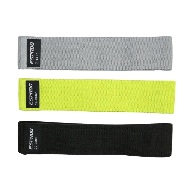 Набор фитнес-резинок тканевых Espado - это набор, включающий три текстильные фитнес резинки с разным уровнем нагрузки, предназначенные для функционального тренинга и укрепления мышечного корсета, бедер, ягодиц, рук и плечевого пояса. Основное удобство фитнес резинок - это их компактность, удобство хранения, переноски и использования в любом удобном месте. Преимущества: текстиль не соскальзывает; гипоаллергенный материал; компактность и простота в использовании; безопасность и эффективность тренировок. Различные уровни нагрузки и сопротивления: серый - 7-14 кг, зеленый - 14-20 кг, черный - 20-30 кг. Материал: полиэстер, хлопок, латекс. Сделано в Китае.