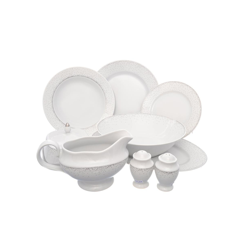 Набор столовой посуды на 6 персон Repast Жемчуг 25 предметов фарфоровый белый (47578) Столовый набор Repast - это современный и элегантный дизайн выполнен из фарфора безупречной белизны. Только представьте, как замечательно он будет выглядеть на вашем столе! Сдержанный, торжественный и по королевский одновременно. Сервиз столовый на 6 персон изготовлен из белоснежного фарфора, декорирован ажурным тиснением и рельефными гранями. Ничего лишнего и все прекрасно! Универсальный цвет, великолепное качество и экологическая безопасность. Сервиз столовый белый Repast можно использовать как для повседневного стола, так и для праздничного. Белоснежно-белое с идеальными формами и сдержанным круговым декором идеальное украшение любого стола. Блюдо сервировочное из натурального экологически чистого материала обладает высокой прочностью и способностью создавать праздник за столом каждый день. Можно мыть в посудомоечной машине. Изделия не выделяют вредных веществ, наделены особой прочностью, очень долговечны и функциональны. В состав сервиза входит: - 6 обеденных тарелок, 25 см; - 6 десертных тарелок, 19 см; - 6 суповых тарелок, 22,5 см; - салатник, 23 см; - блюдо овальное большое, 33 см; - блюдо овальное малое, 22 см; - соусник; - масленка с крышкой; - солонка и перечница.