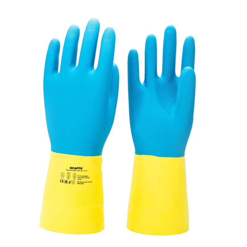 Перчатки КЩС латексные/неопреновые Scaffa Спектр желтые/синие (размер 11). Двухслойные герметичные латексные/неопреновые перчатки с надежной защитой широкого спектра химических веществ, обладают высокой стойкостью к моющим средствам. Неопреновая поверхность повышает механическую прочность, а так же сохраняет гибкость и эластичность в холодных условиях. Хлорированная поверхность повышает механическую прочность и уменьшает аллергическую реакцию на латексные белки. Текстура рабочей поверхности "пчелиные соты" обеспечивает превосходное сцепление в сухом и влажном состоянии. Плотное хлопчатобумажное покрытие на внутренней поверхности выполнено для удобства надевания и использования, уменьшения аллергических реакций на белки латекса, а так же для комфортной теплоизоляции. Данная модель безопасна для контакта с пищевыми продуктами (имеется экспертное заключение о соответствии продукции кдим санитарно-эпидемиологическим и гигиеническим требованиям). Размер: 10-11, XXL. Тип манжеты: прямой. Соответствуют стандартам: EN ISO 374-1:2016, EN 388:2016, EN ISO 374-5:2016, ГОСТ 12.4.183-91, ГОСТ 12.4.252-2013, ТР ТС 019/2011. Количество пар в упаковке: 1. Количество единиц в транспортной упаковке: 120. Соответствует регламенту ЕС 1935/2004. Разрешен контакт с пищевыми продуктами.