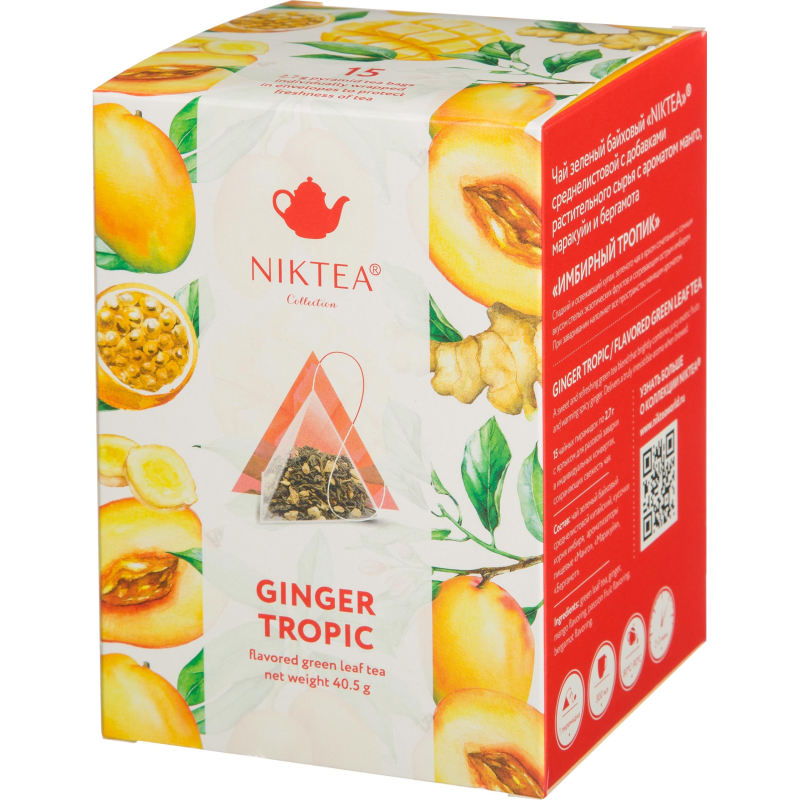 Чай Niktea Имбирный Тропик- это сладкий и освежающий купаж зеленого чая в ярком сочетании с сочным вкусом спелых экзотических фруктов и согревающим острым имбирем. Сегодня, тропические и пикантные вкусы находятся в авангарде вкусовых предпочтений, поэтому в этом чае объединены одни из самых любимых экзотических фруктов- манго и маракуйя, напоминающие о летнем отдыхе на далеких островах Юго-Восточной Азии. Однако, к этому экзотическому коктейлю был добавлен имбирь, в качестве натурального функционального ингредиента, который не только придает чаю реально жгучую ноту, но и помогает укреплять организм и усиливает его защитные свойства. В пирамидки фасуется настоящий листовой чай. Он герметично зафасован в индивидуальные конвертики, благодаря чему долго сохраняет свой изначальный вкус и аромат. Вес: 40,5 г. Тип упаковки: картонная. Условия хранения: хранить в чистом, хорошо вентилируемом помещении без посторонних запахов при относительной влажности воздуха не более 70%.Страна производства: Россия.