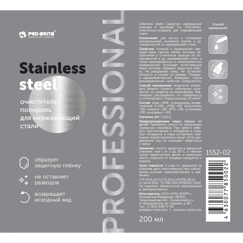 Средство для защиты и полировки нержавеющей стали Pro-Brite Stainless steel 0.2 л. Назначение: Готовый к применению препарат против легких бытовых загрязнений и отпечатков пальцев на полированной и др. нержавеющей стали, а также хромированных и никелированных поверхностях. Не раздражает кожу. Не оставляет липкости и следов на одежде. Пожаро и взрывобезопасный. Замерзает, после размораживания свойства сохраняются. Способ применения: Энергично встряхнуть бутылку! Нанести небольшое количество препарата на салфетку из микрофибры. Равномерно распределить по поверхности и отполировать. Состав: вода, НПАВ