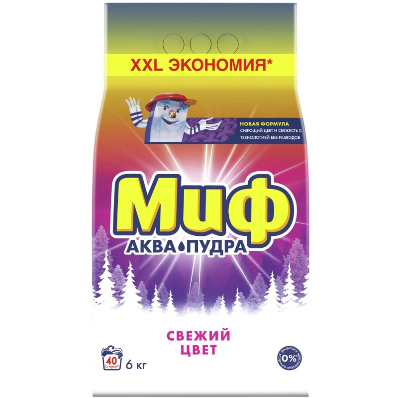 Порошок стиральный автомат Миф 3в1 Свежий цвет 6 кг. Назначение: Стиральный порошок Миф Аквапудра растворяется едва коснувшись воды, и моментально активируется: удаляет даже трудновыводимые пятна и придает одежде сияющую чистоту. С помощью технологии против разводов, Миф помогает эффективно справляться с загрязнениями, не оставляя разводов на одежде. Только чистота и морозная свежесть! ПРЕИМУЩЕСТВА МИФ АКВАПУДРА: - Новый, улучшенный аромат - Яркие цвета и свежесть - Новая формула с технологией против разводов - Не содержит фосфатов и хлорного отбеливателя - Удаляет трудновыводимые пятна, оставляя только яркость цвета и свежий аромат чистоты Миф тщательно подбирает ингредиенты для своих средств. Мы не используем фосфаты и никогда не использовали хлорные отбеливатели. Для отбеливания мы подбираем кислородосодержащие отбеливатели и безопасные дозировки. Все активные компоненты полностью биоразлагаемы. Для большего эффекта используйте кондиционер для белья Lenor: он не только придает свежесть и мягкость вашему белью, но и защищает одежду от появления катышков, потери формы и потери цвета. Теперь ваши любимые вещи прослужат вам еще дольше. Способ применения: Засыпать стиральный порошок в стиральную машину в отсек для стирального порошка. Меры предосторожности: Беречь от детей. Избегать попадания в глаза. При попадании в глаза - немедленно промыть проточной водой. Не глотать. При проглатывании обратитесь за медицинской помощью. Хранить вдали от пищевых продуктов. При повышенной чувствительности и повреждениях кожи избегать длительного контакта с любыми средствами для стирки. Состав: 5-15% Анионные ПАВ,