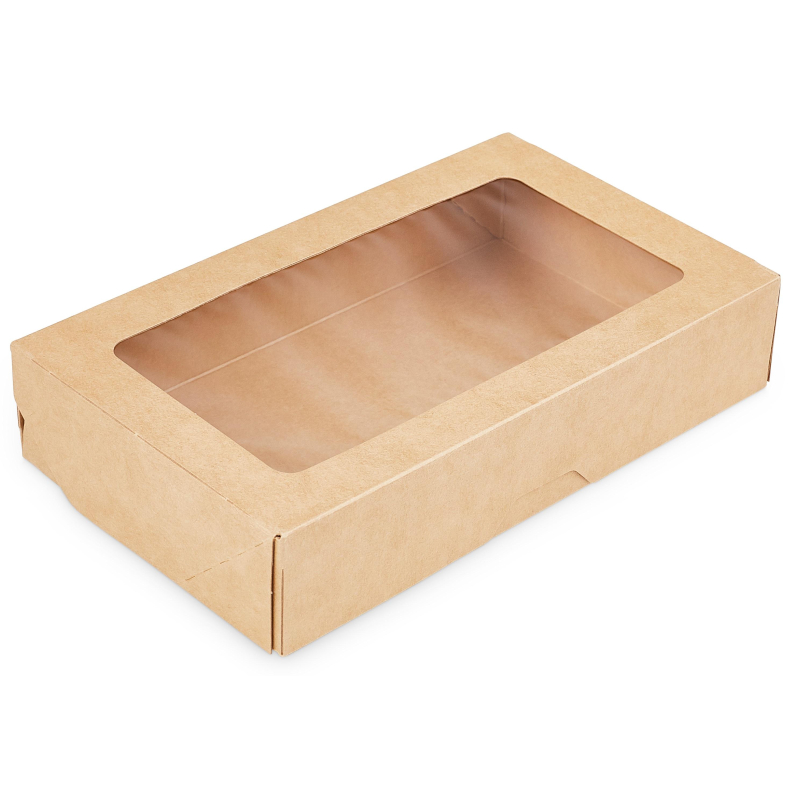 Контейнер OneClick 200x120x40 мм подходит для кондитерских изделий, роллов и суши. Контейнер прямоугольной формы изготовлен из крафт картона, с вклейкой окна (окно с эффектом Antifog - не запотевает при наличии горячего продукта). Температурный диапозон применения от - 15 до + 50 градусов. Объем контейнера 1000 мл.