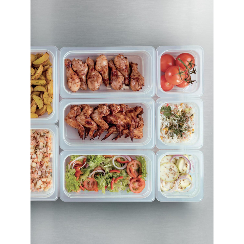 Гастроемкость Restola GN 1/3 325x176x150 мм 5.7 л полипропилен Не содержит бисфенол А (BPA free). Применение: можно использовать для замораживания продуктов до -40°С, разогревания в СВЧ-печи до +100°С; в мармитах на линиях раздачи. Можно мыть в посудомоечной машине до +95°С.